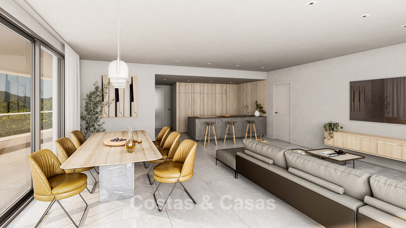 Open woonruimte met een tv-lounge en geïntegreerde eetruimte.