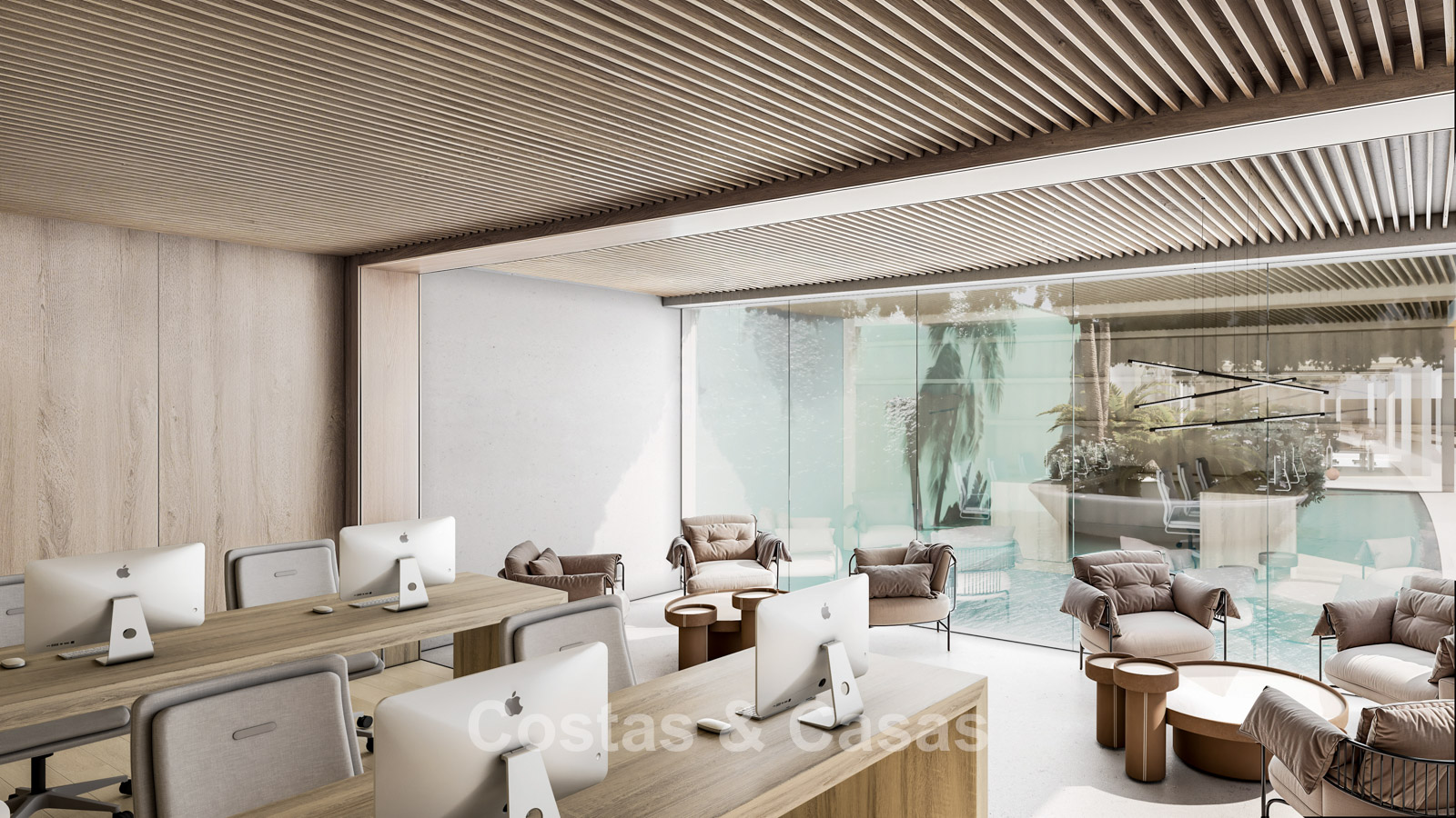 Het complex biedt uitgebreide extra faciliteiten waaronder een spectaculair overloopzwembad, moderne gym met kleedkamers, en een coworkingruimte.