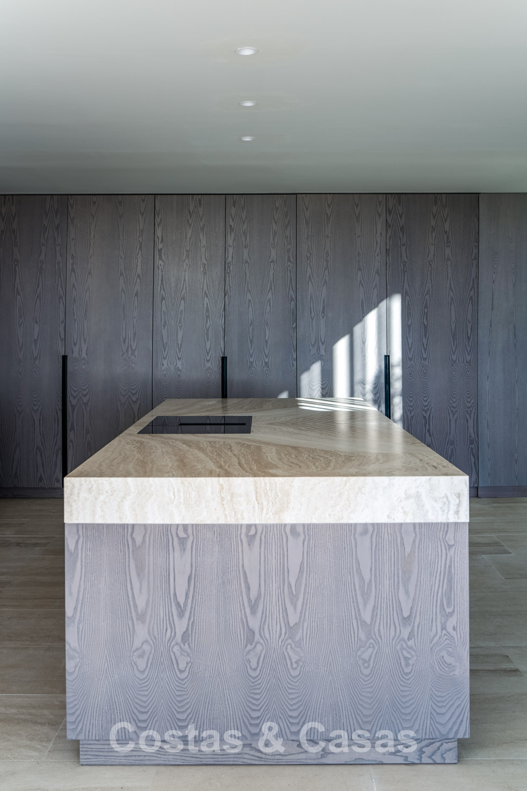 De open keuken met centraal kookeiland ademt tijdloze luxe en verenigt esthetiek, comfort en hoogwaardige afwerking.