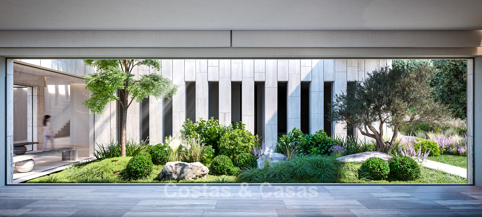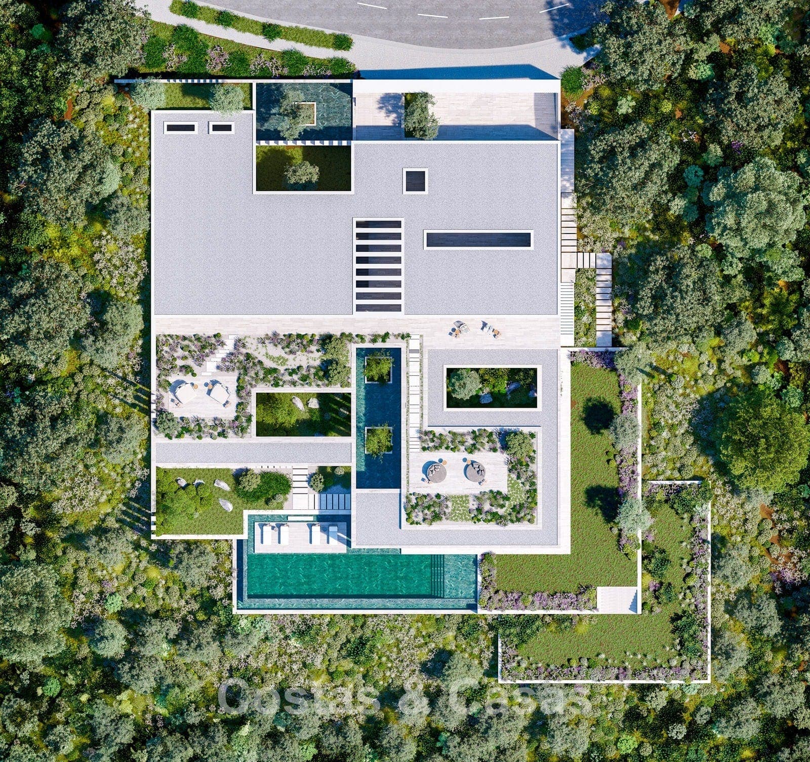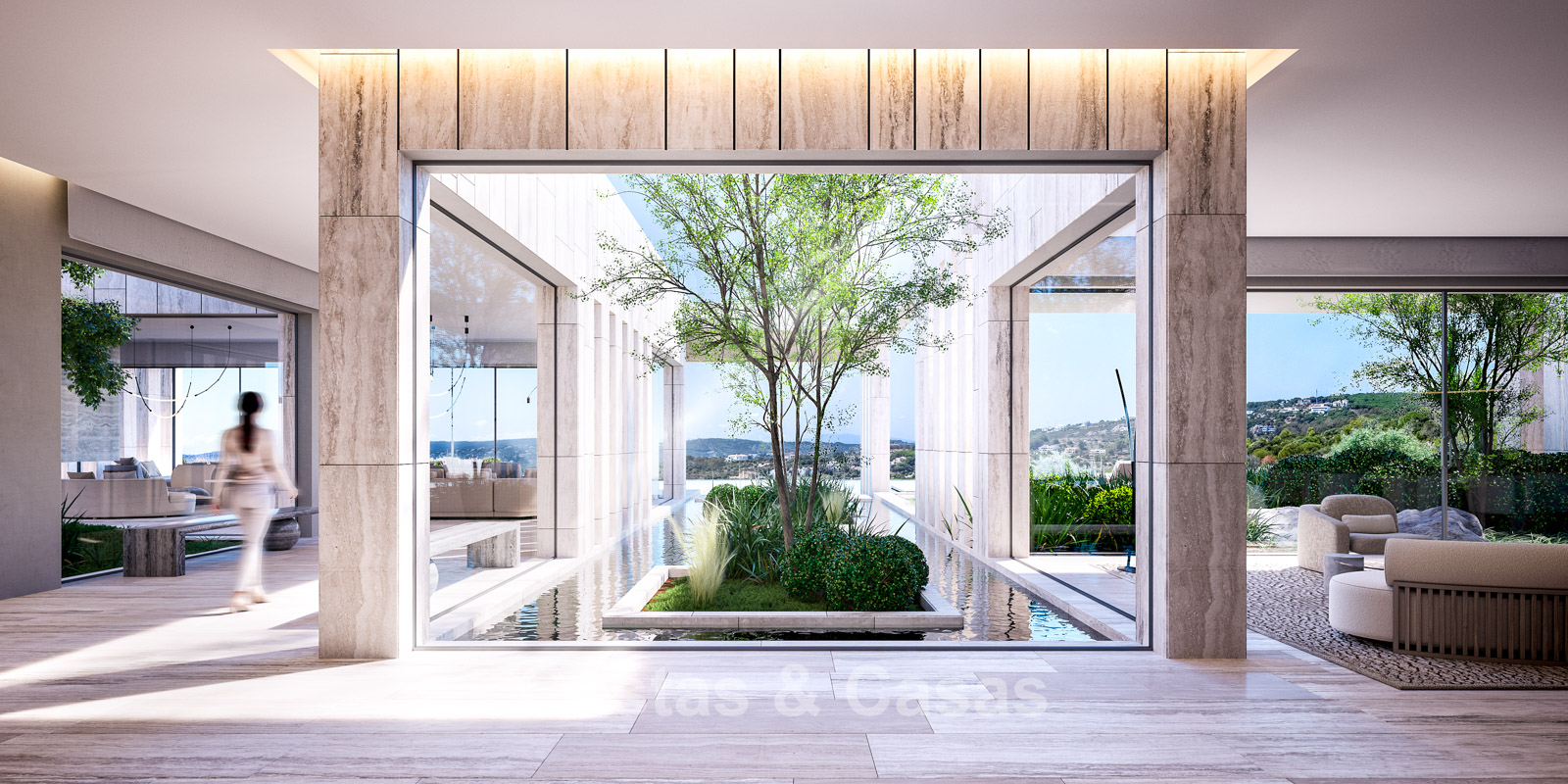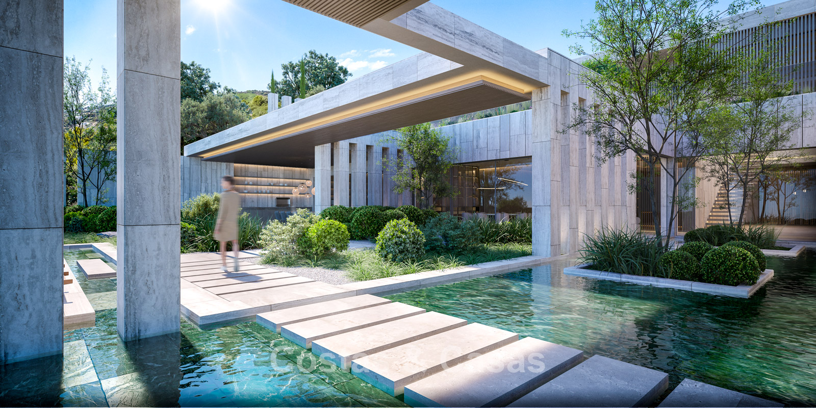 Strak vormgegeven waterpartijen vloeien als een serene loper door het ontwerp.