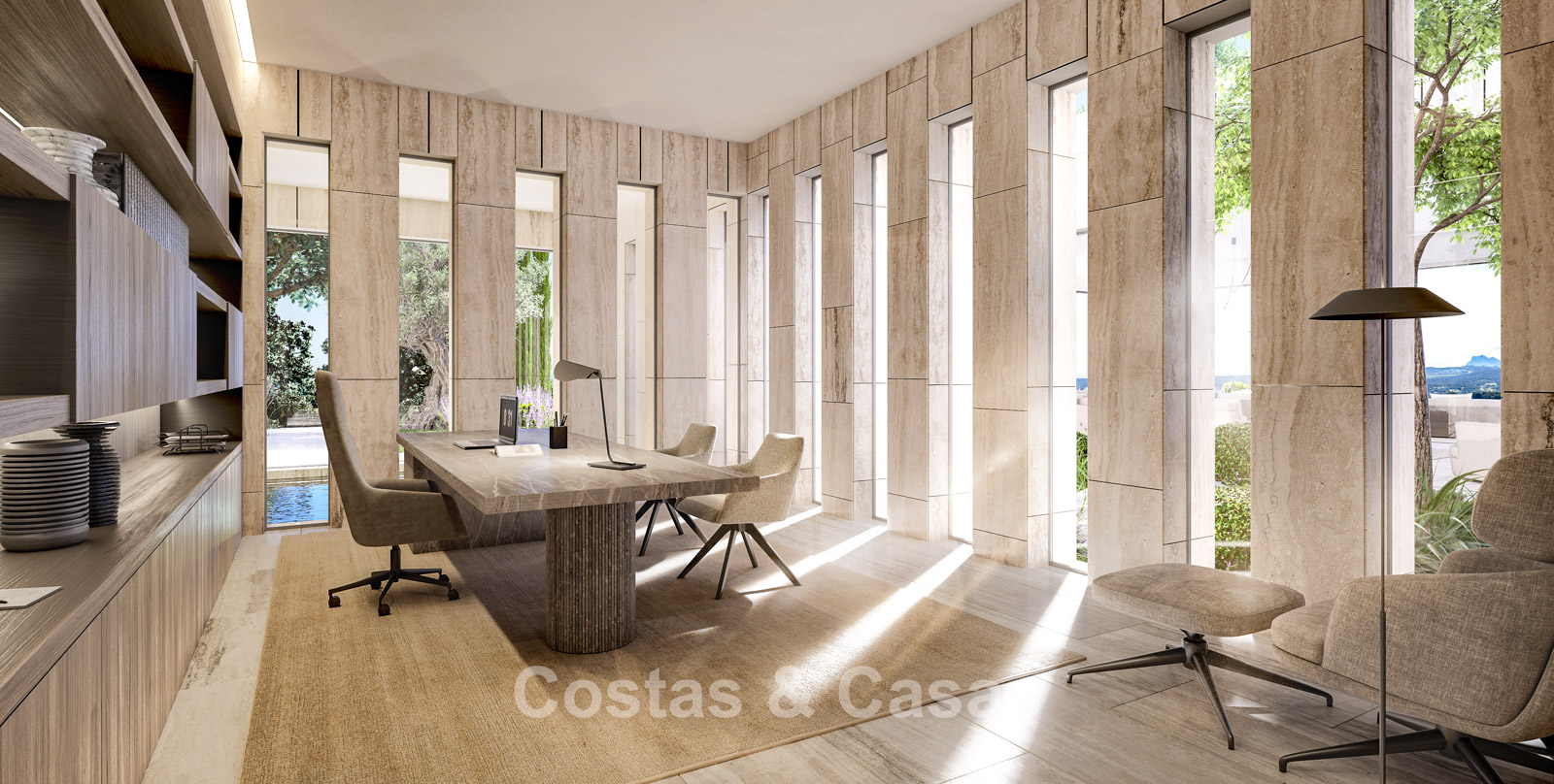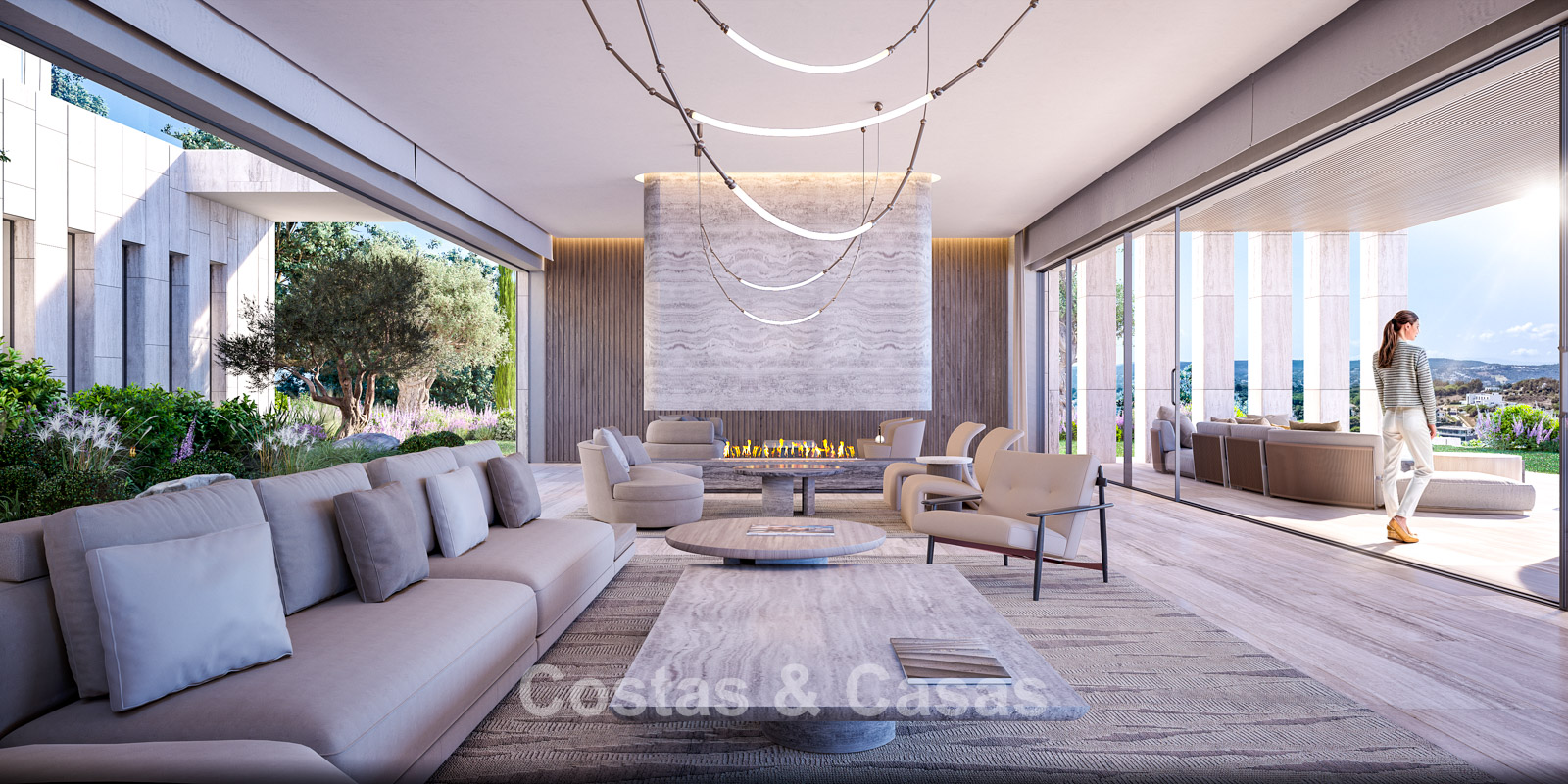 De volledig open te schuiven glazen wanden en royale patio’s zorgen niet alleen voor een elegante uitstraling, maar creëren ook een constante dialoog tussen het interieur en het omliggende landschap.