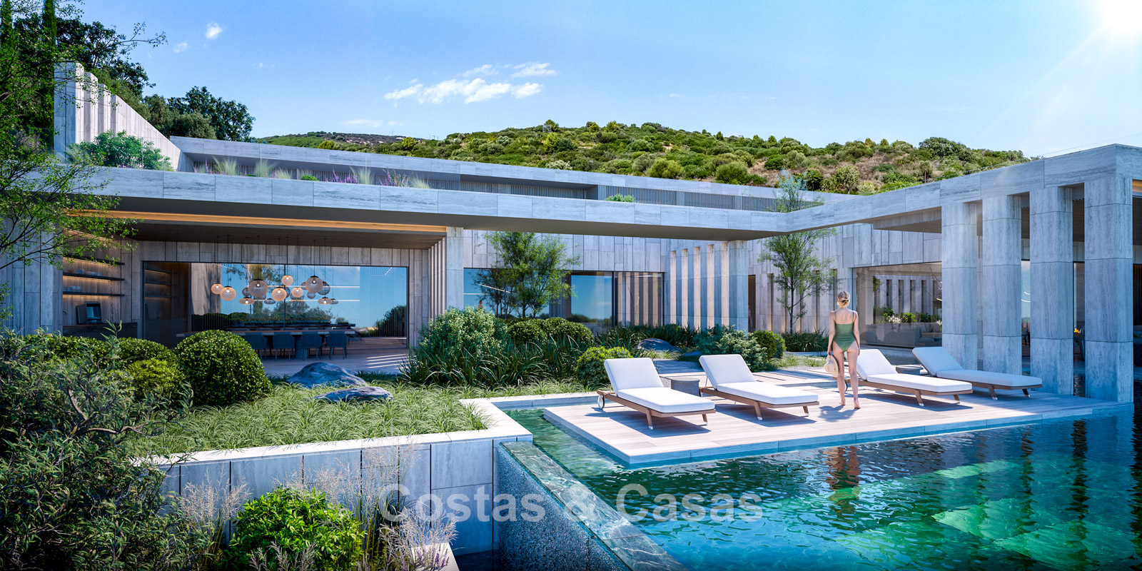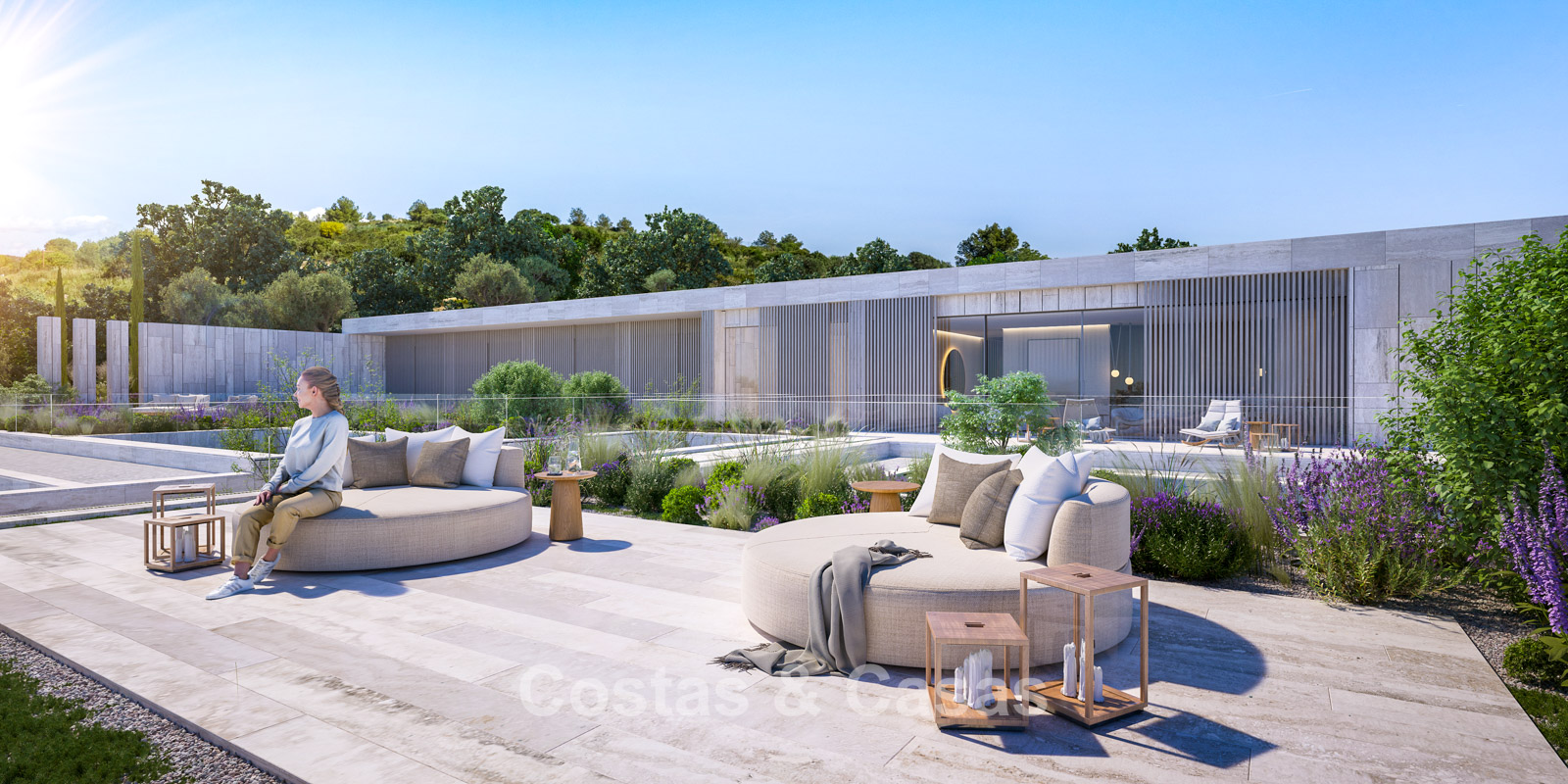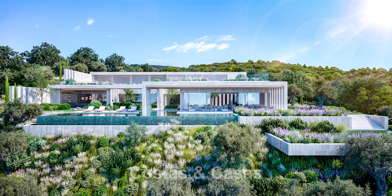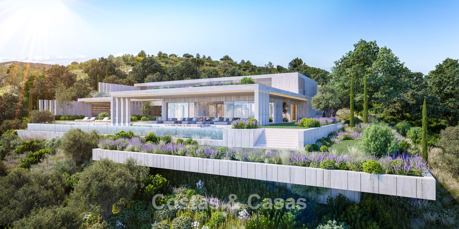 De mediterrane landschapstuinen vloeien in terrassen langs de heuvelrand naar beneden en vormen een harmonieus geheel met de strakke architectuur.
