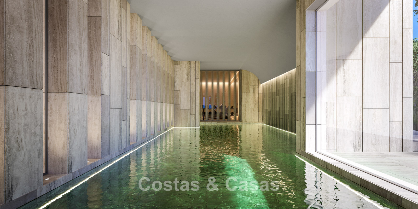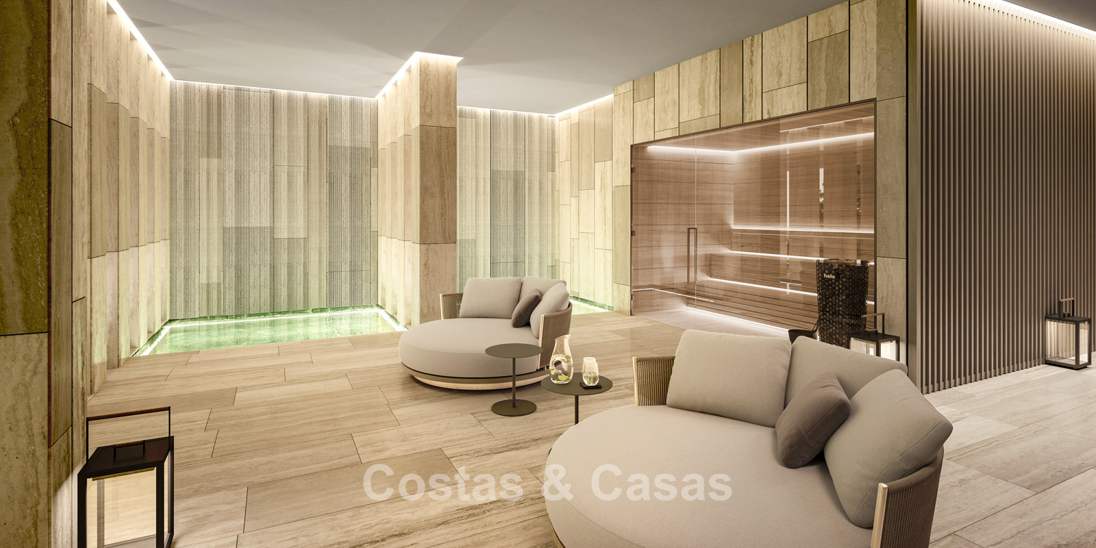 Een luxe indoor wellness area met een binnenzwembad, ontspannende sauna, Turks stoombad, jacuzzi, loungers en een eigen badkamer.