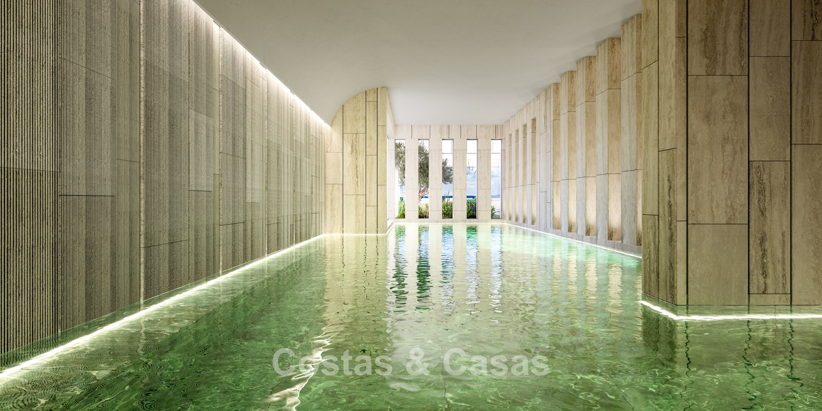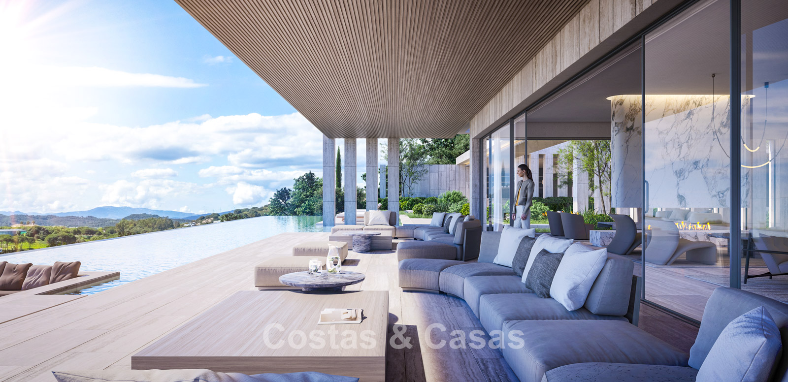 Een architecturaal vormgegeven overloopzwembad, omlijst door royale loungeruimtes.