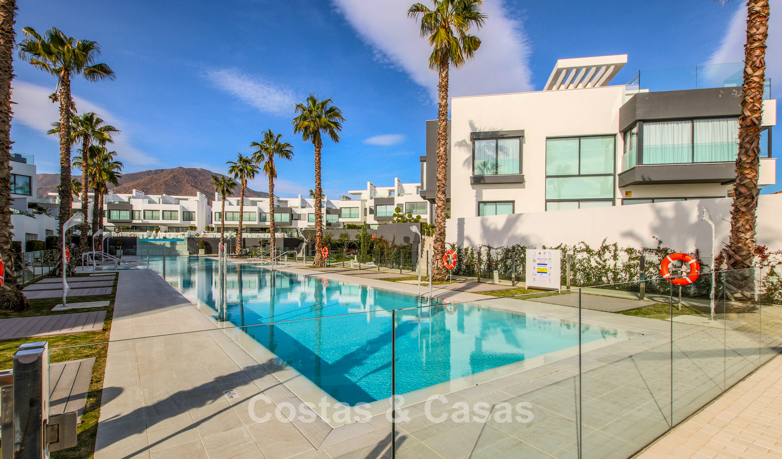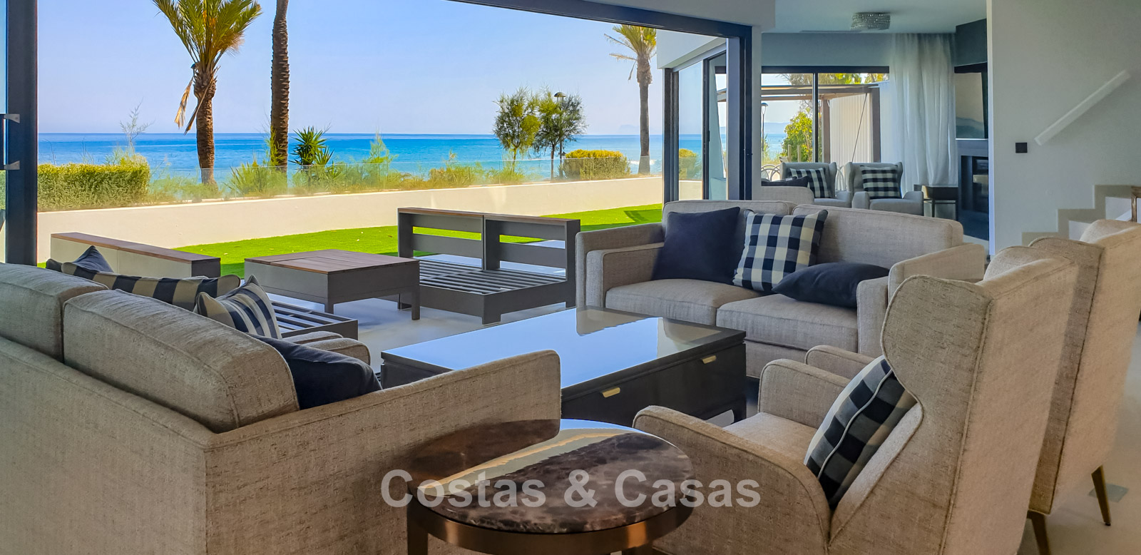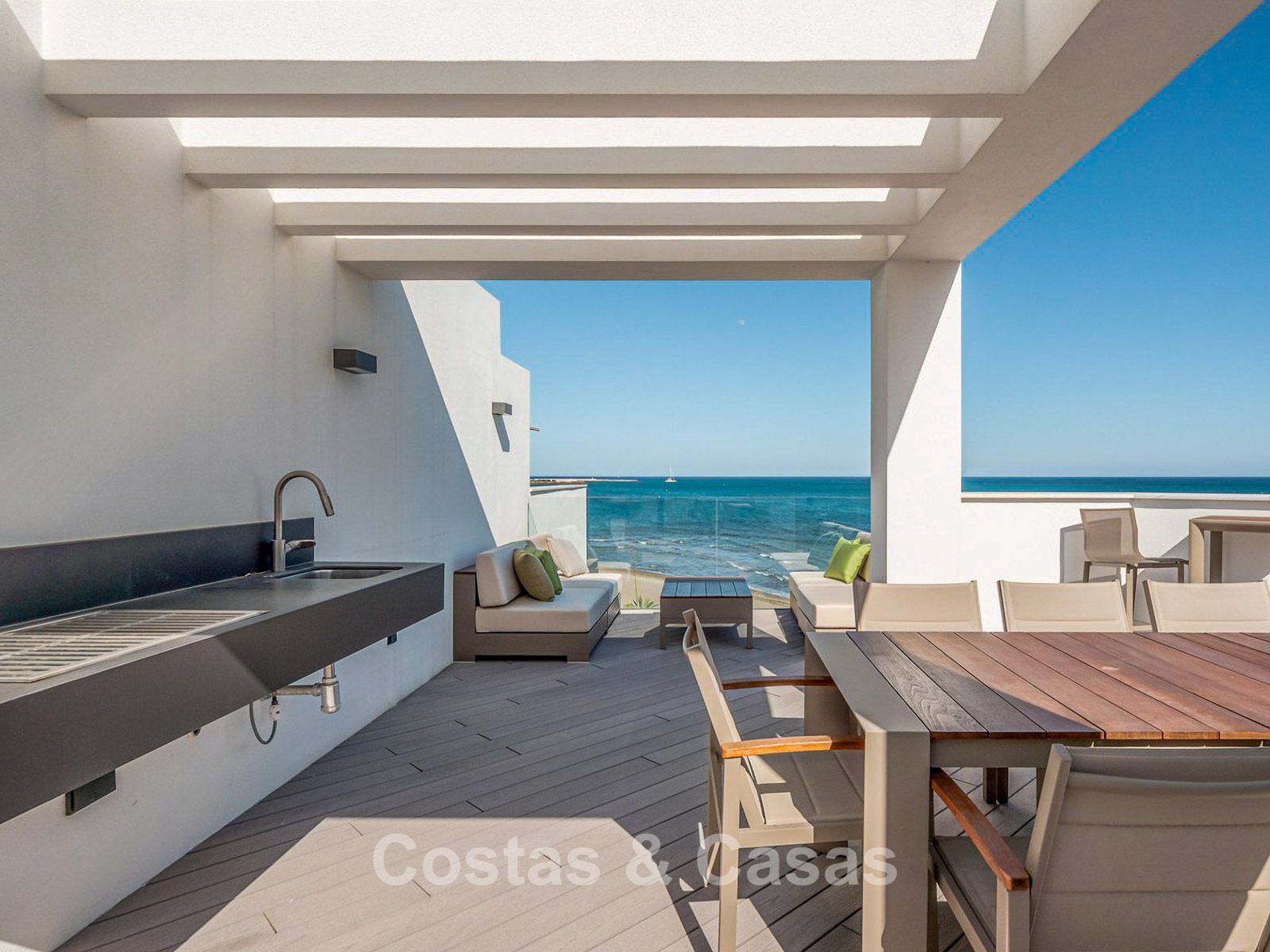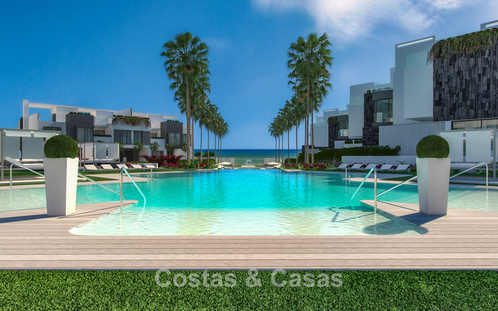 Instapklare, moderne, eerstelijnsstrand luxe rijwoning te koop met frontaal zeezicht, op wandelafstand van het centrum van Estepona