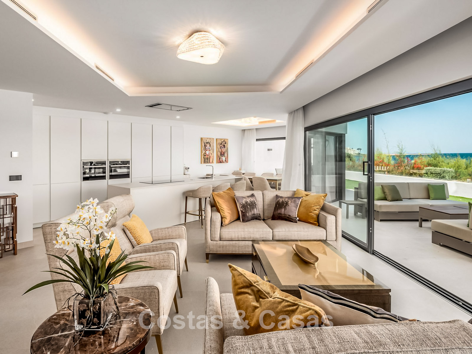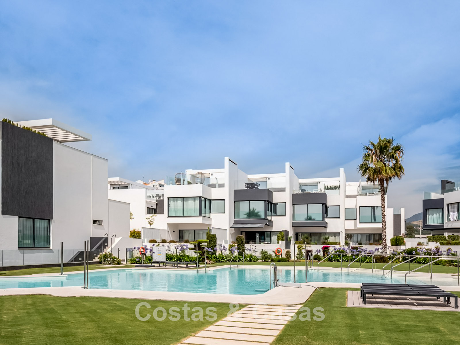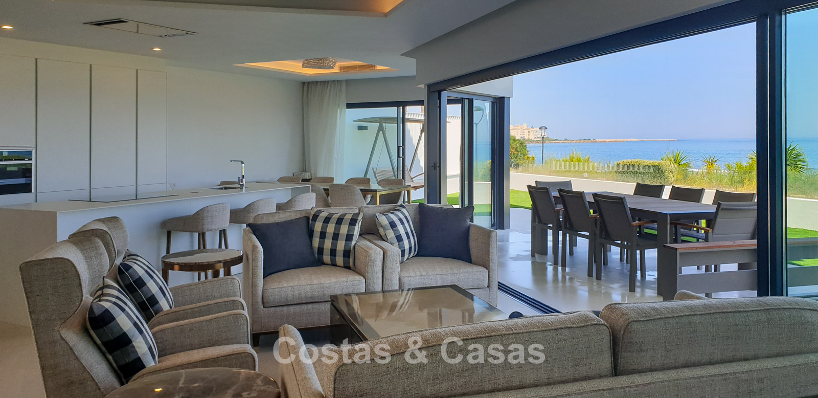 Instapklare, moderne, eerstelijnsstrand luxe rijwoning te koop met frontaal zeezicht, op wandelafstand van het centrum van Estepona