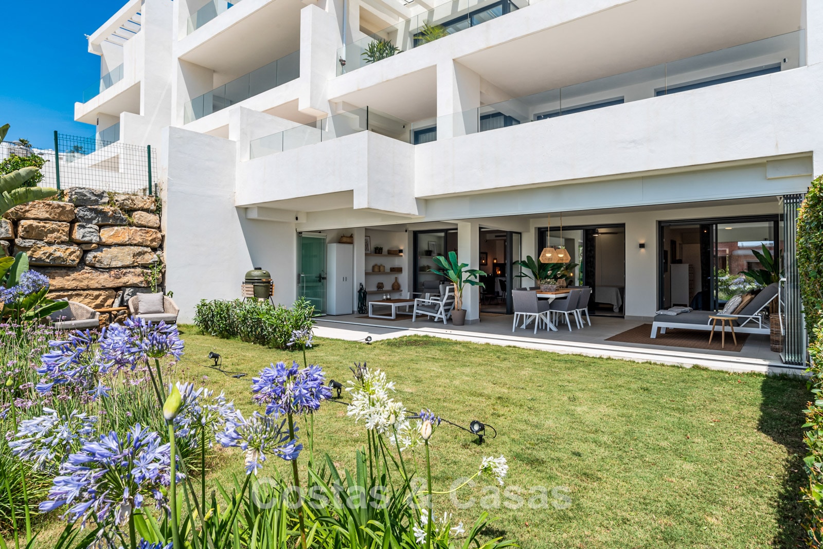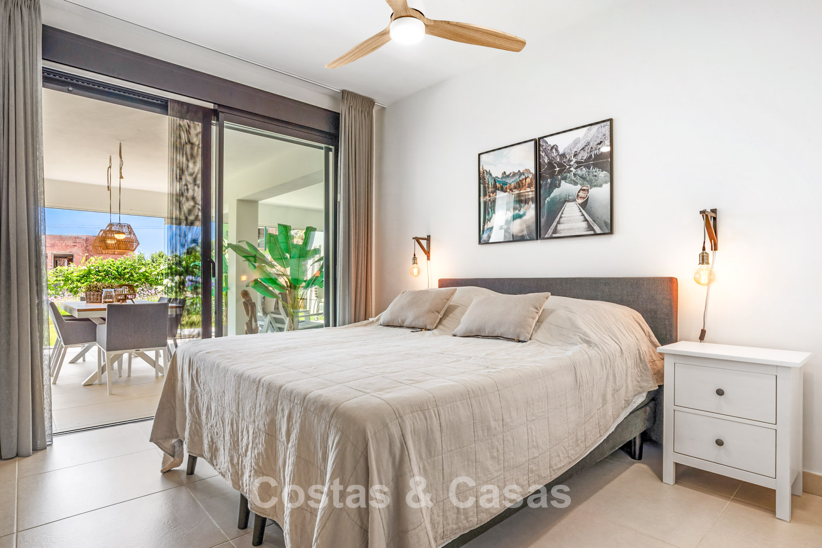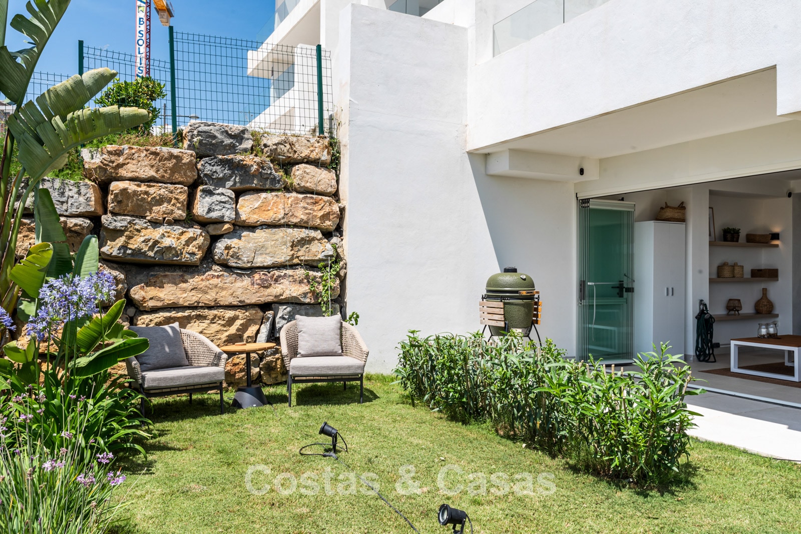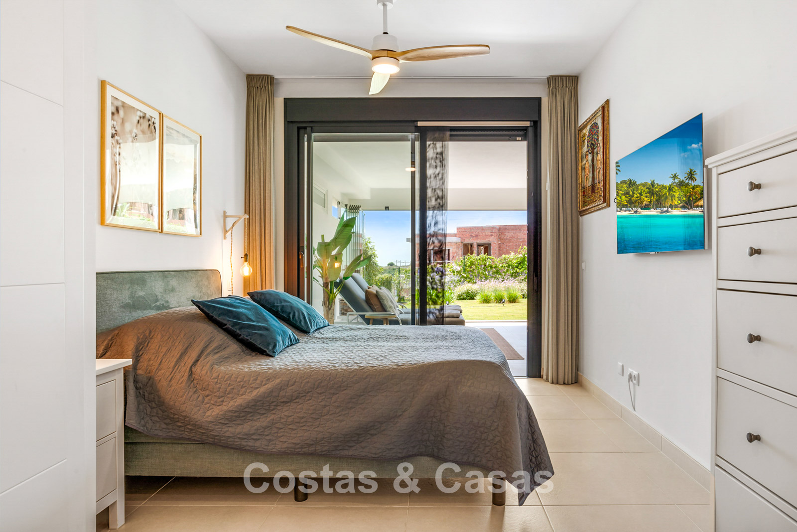 Gelijkvloers, modern appartement met ruime privétuin en deels zeezicht aan de golfbaan te koop in Estepona