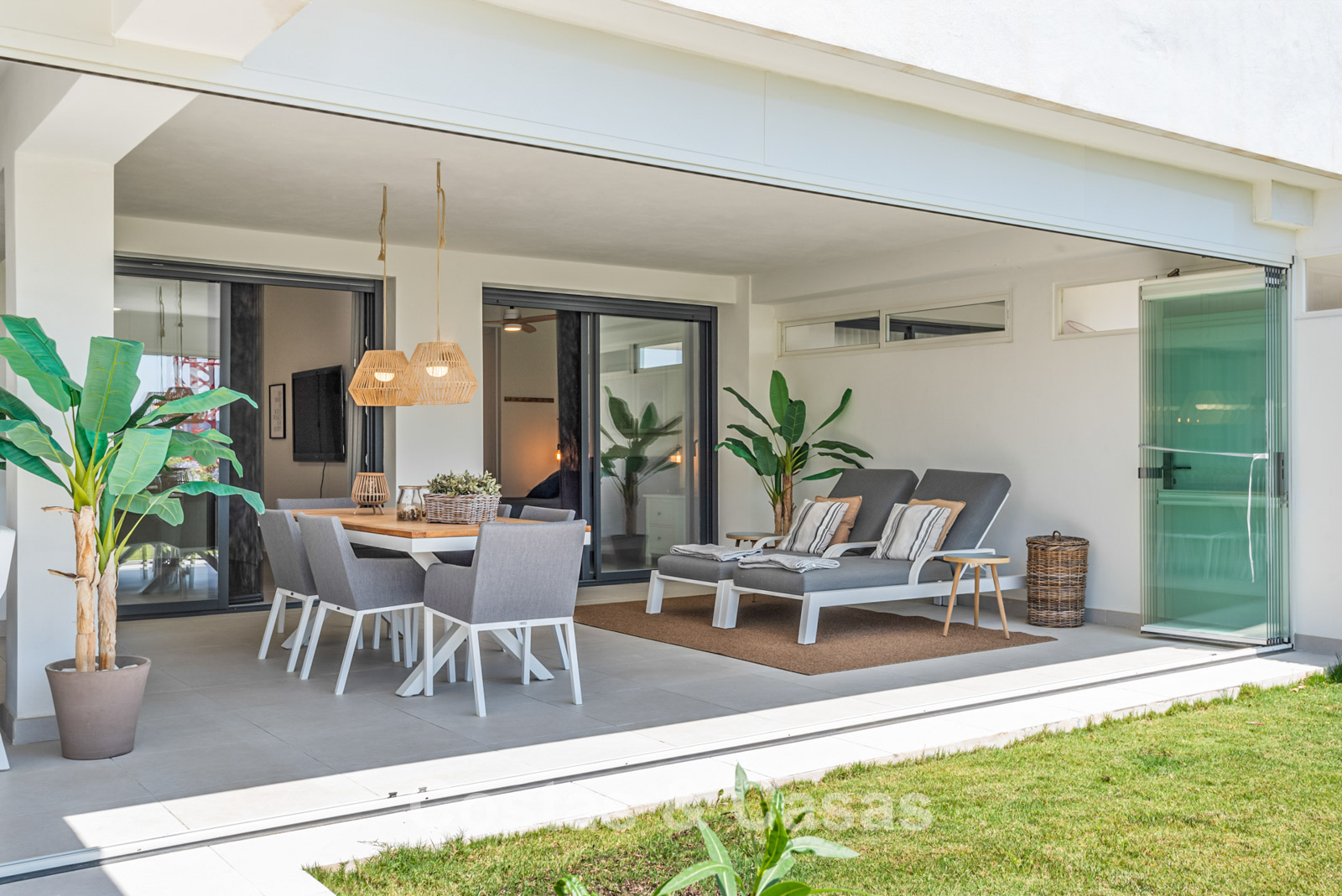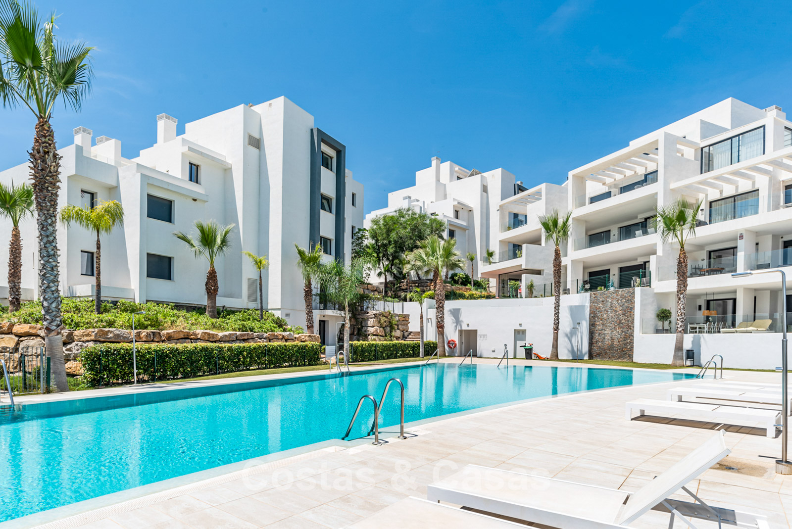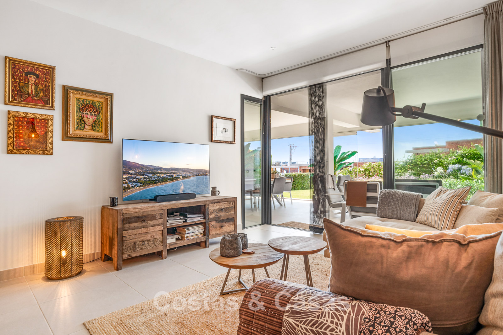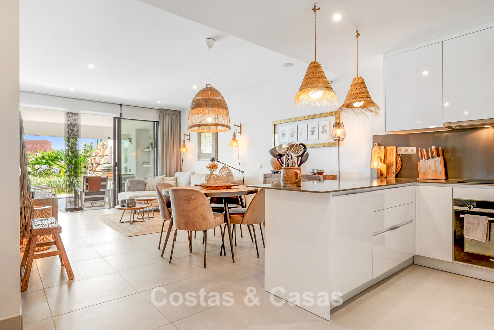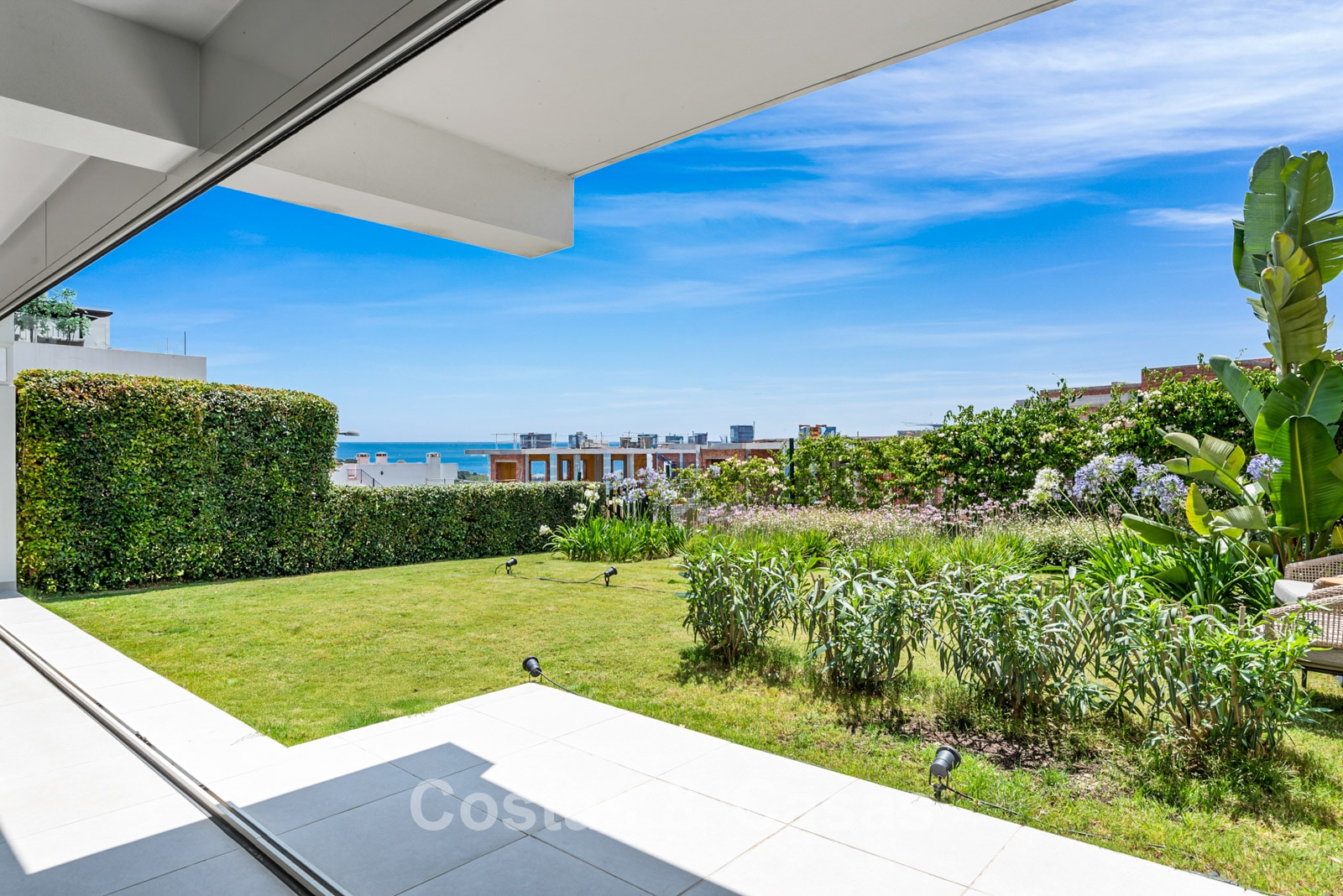 Gelijkvloers, modern appartement met ruime privétuin en deels zeezicht aan de golfbaan te koop in Estepona