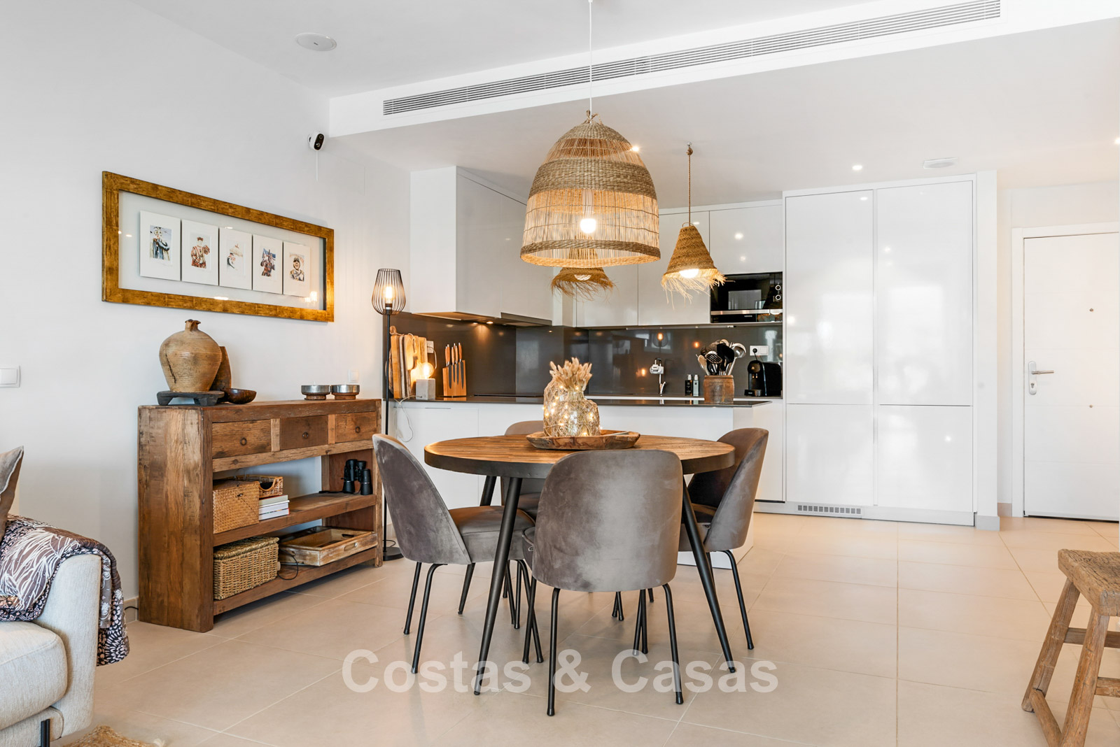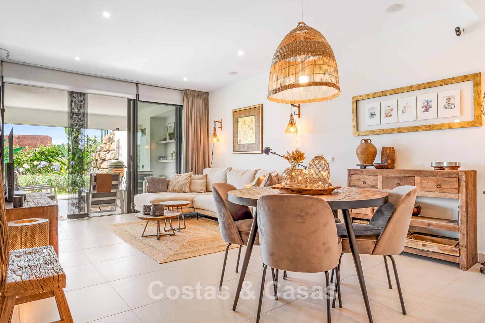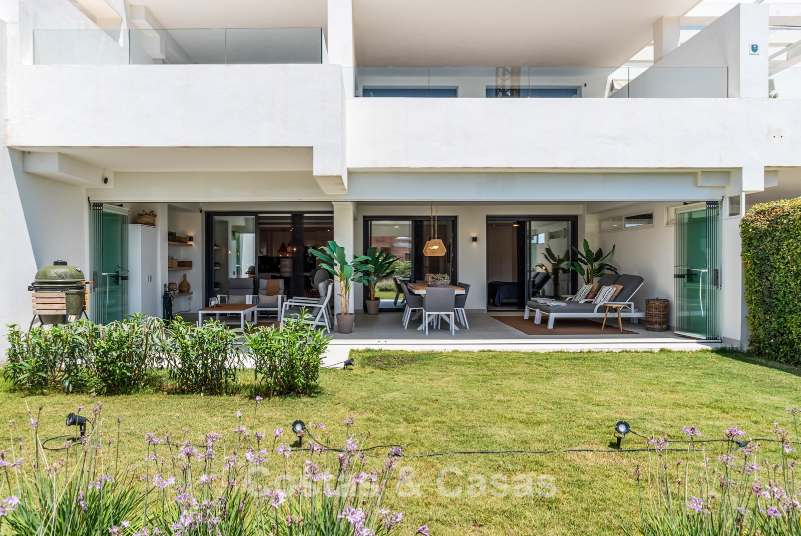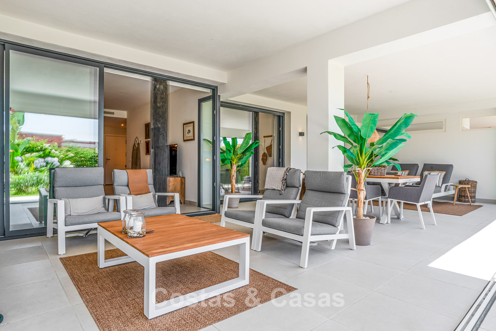 Gelijkvloers, modern appartement met ruime privétuin en deels zeezicht aan de golfbaan te koop in Estepona