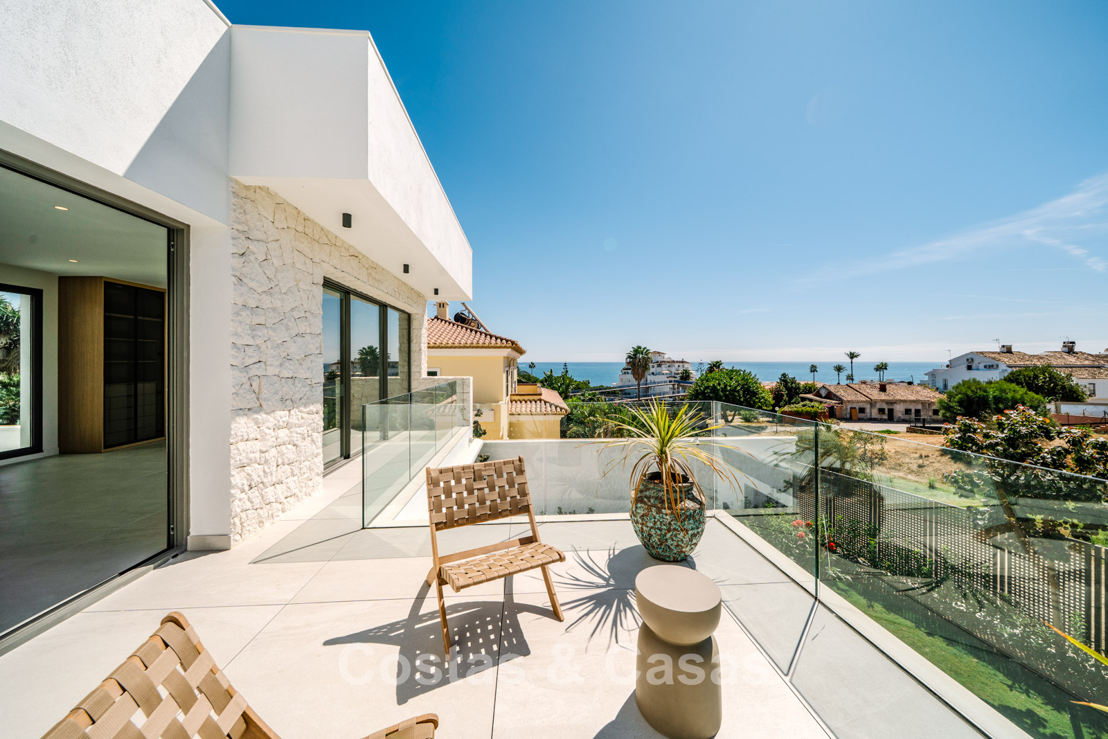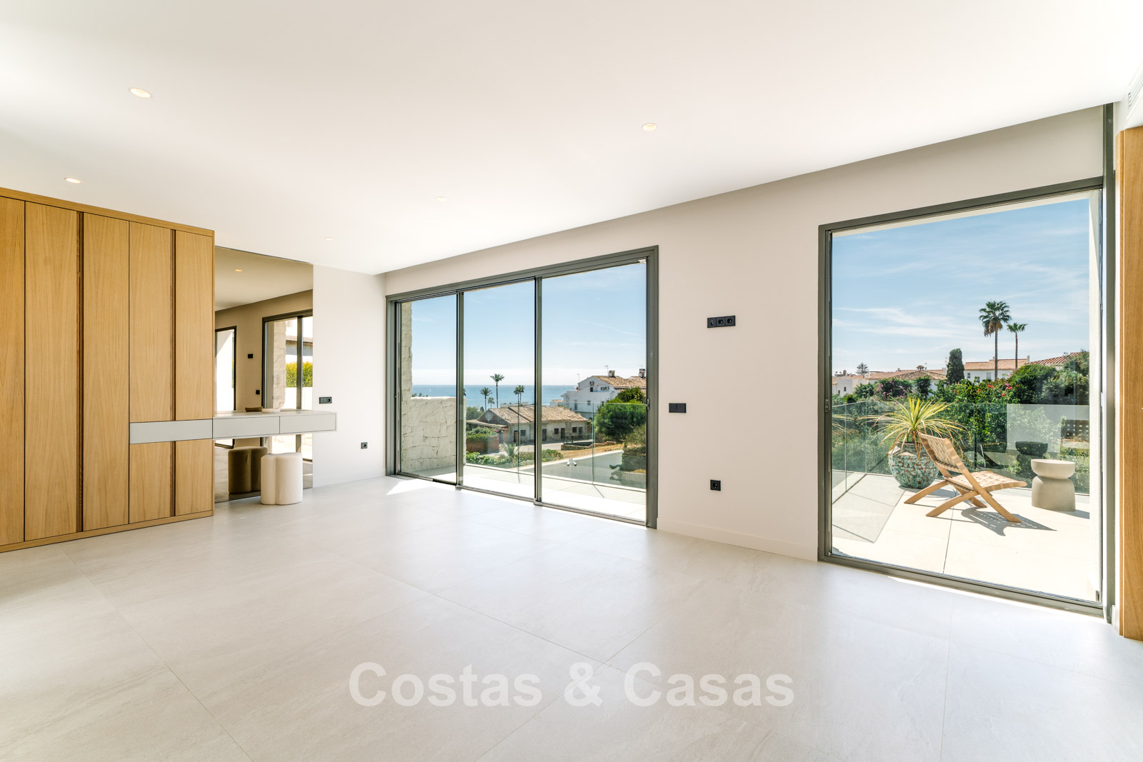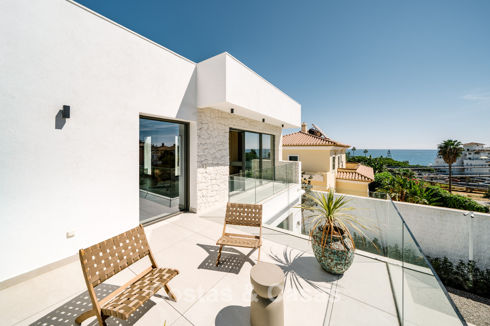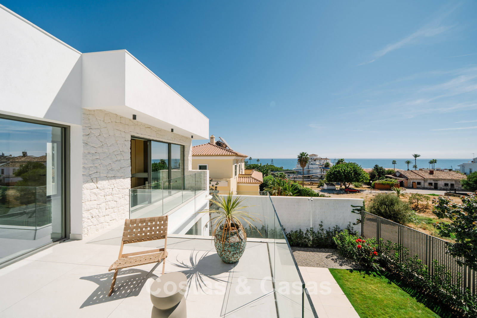 Instapklare nieuwbouwvilla met contemporaine bouwstijl te koop met zeezicht en op loopafstand van het strand in Estepona