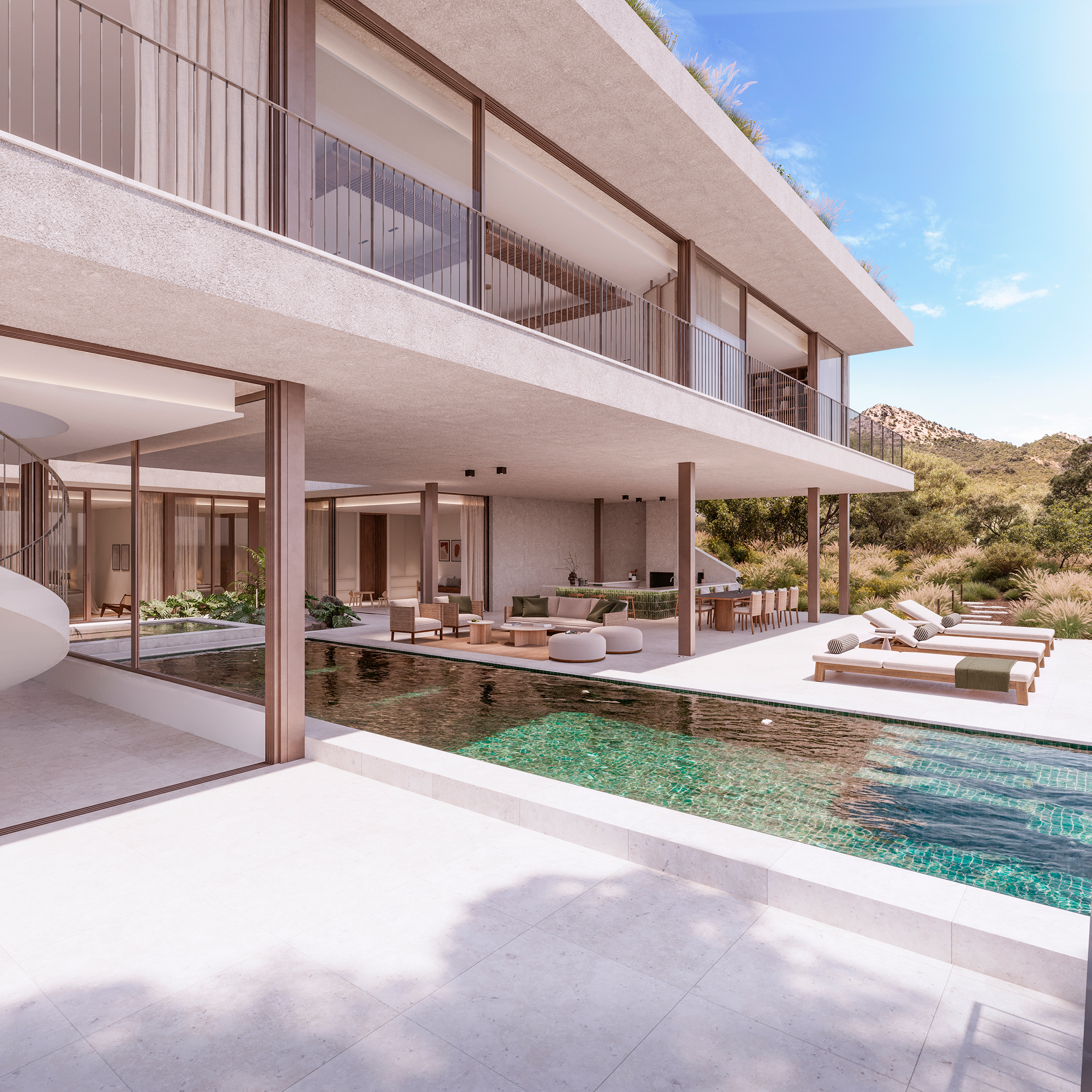 De villa heeft een beperkte impact op de natuurlijke omgeving en beschikt over een groen dak en een droogtetolerante landschapsarchitectuur.