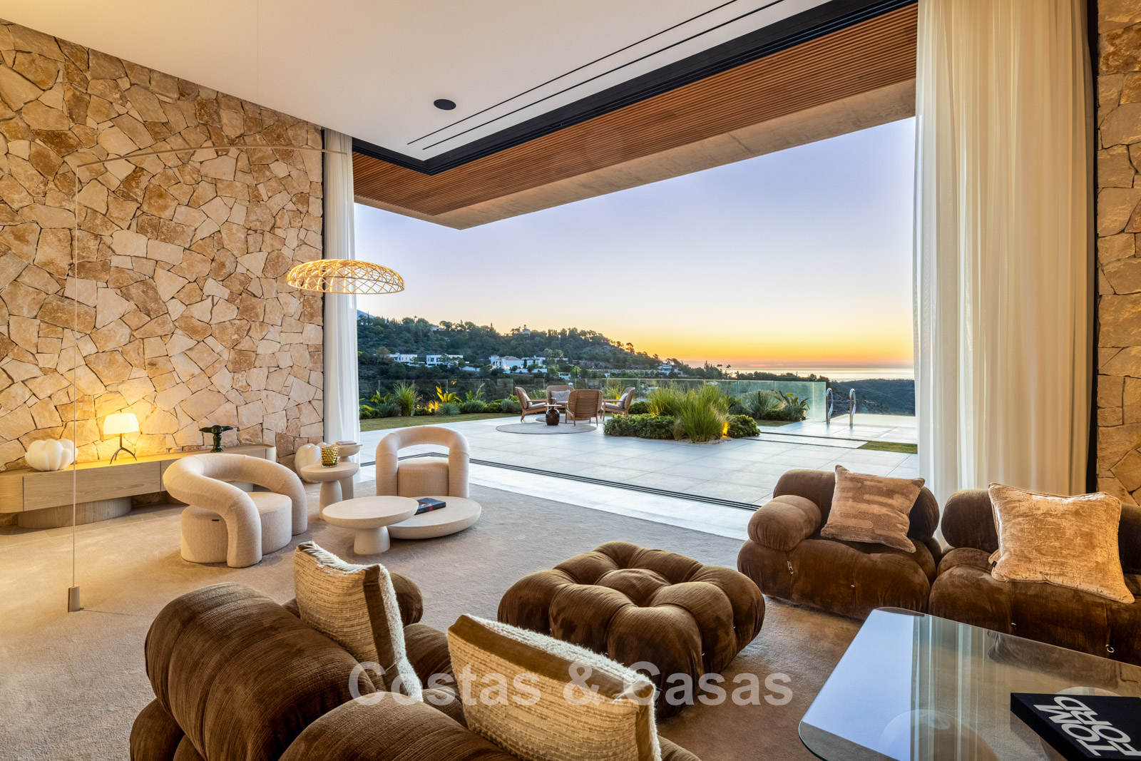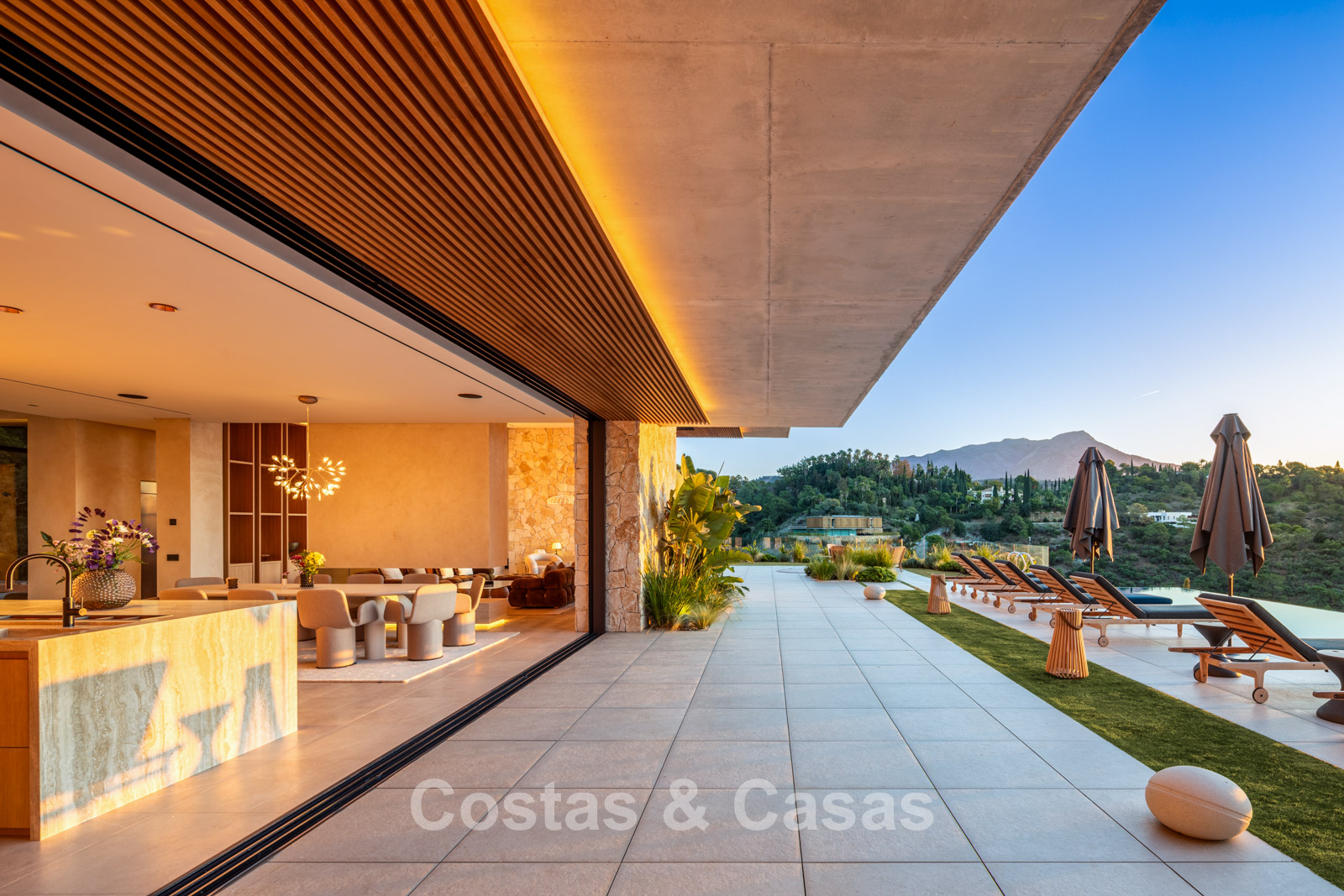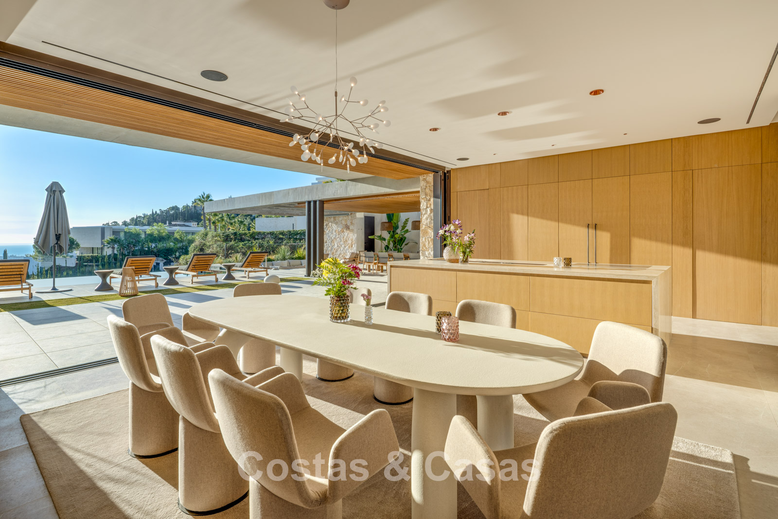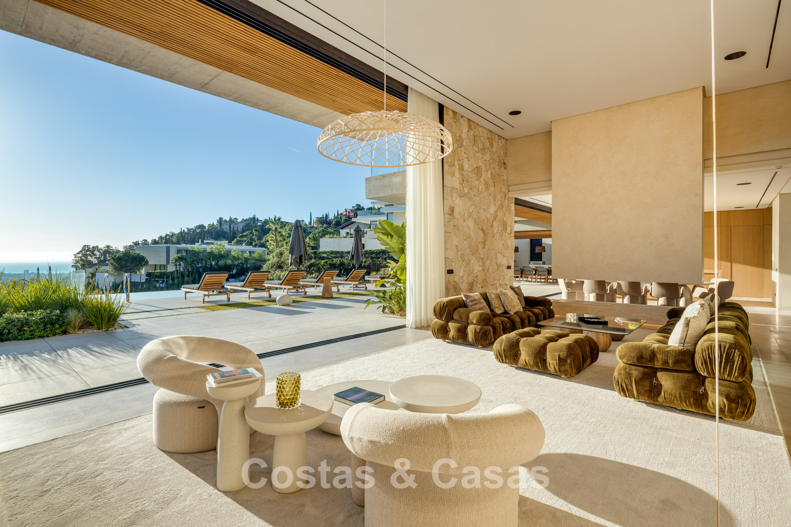 Kamerhoge schuiframen, elektrisch bedienbaar, zorgen voor een naadloze verbinding met het terras, de tuin en het zwembad, wat typisch is voor mediterrane en hedendaagse luxearchitectuur.