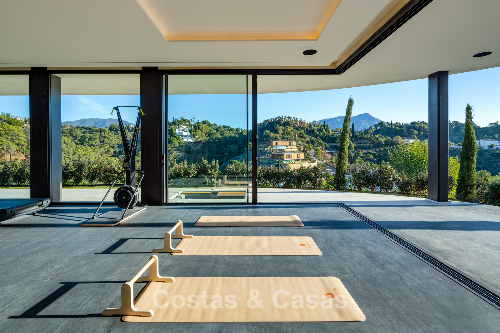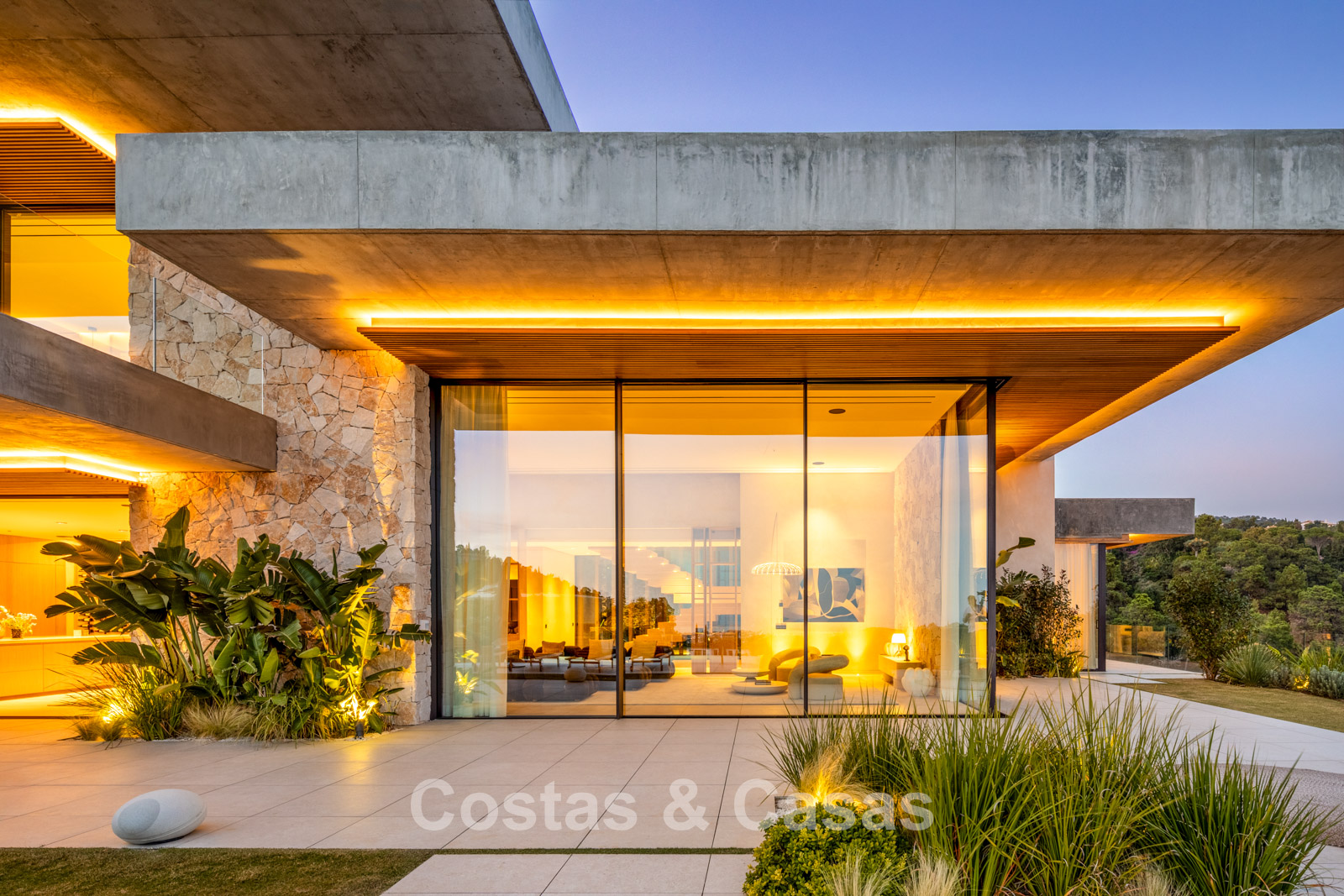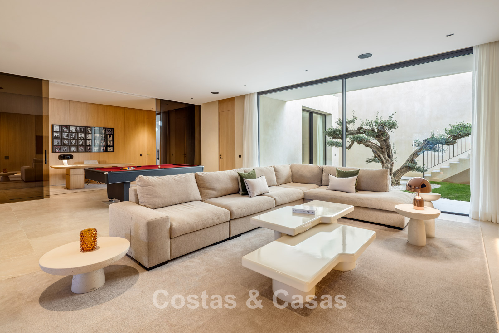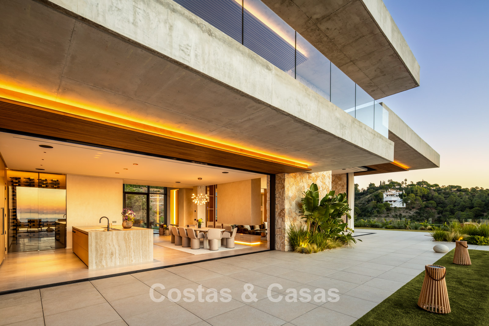 Kamerhoge schuiframen, elektrisch bedienbaar, zorgen voor een naadloze verbinding met het terras, de tuin en het zwembad, wat typisch is voor mediterrane en hedendaagse luxearchitectuur.