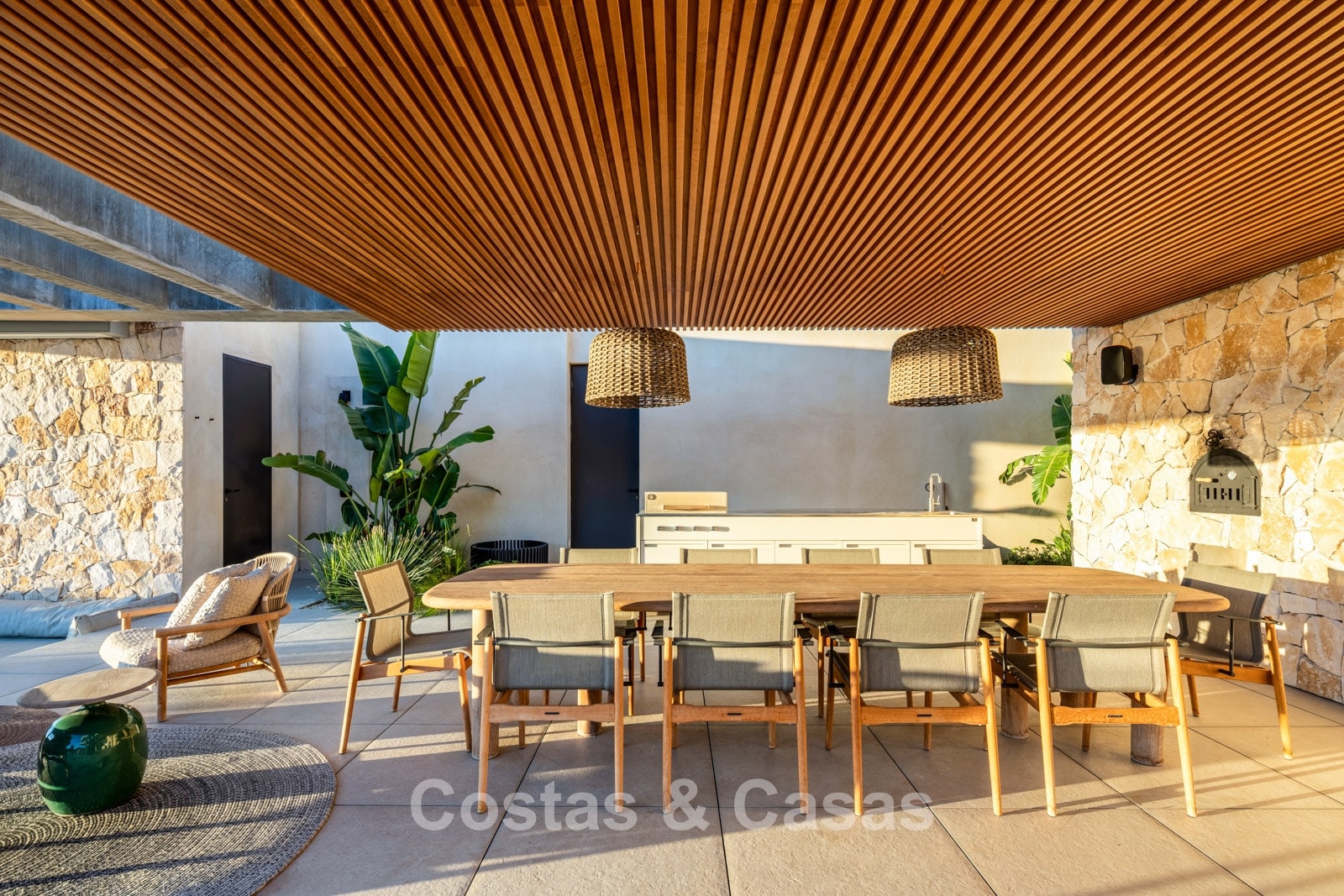 Royale buitenruimtes met een verzonken chill-out, een ‘al fresco dining’ en een buitenkeuken, compleet met barbecue en pizza oven.