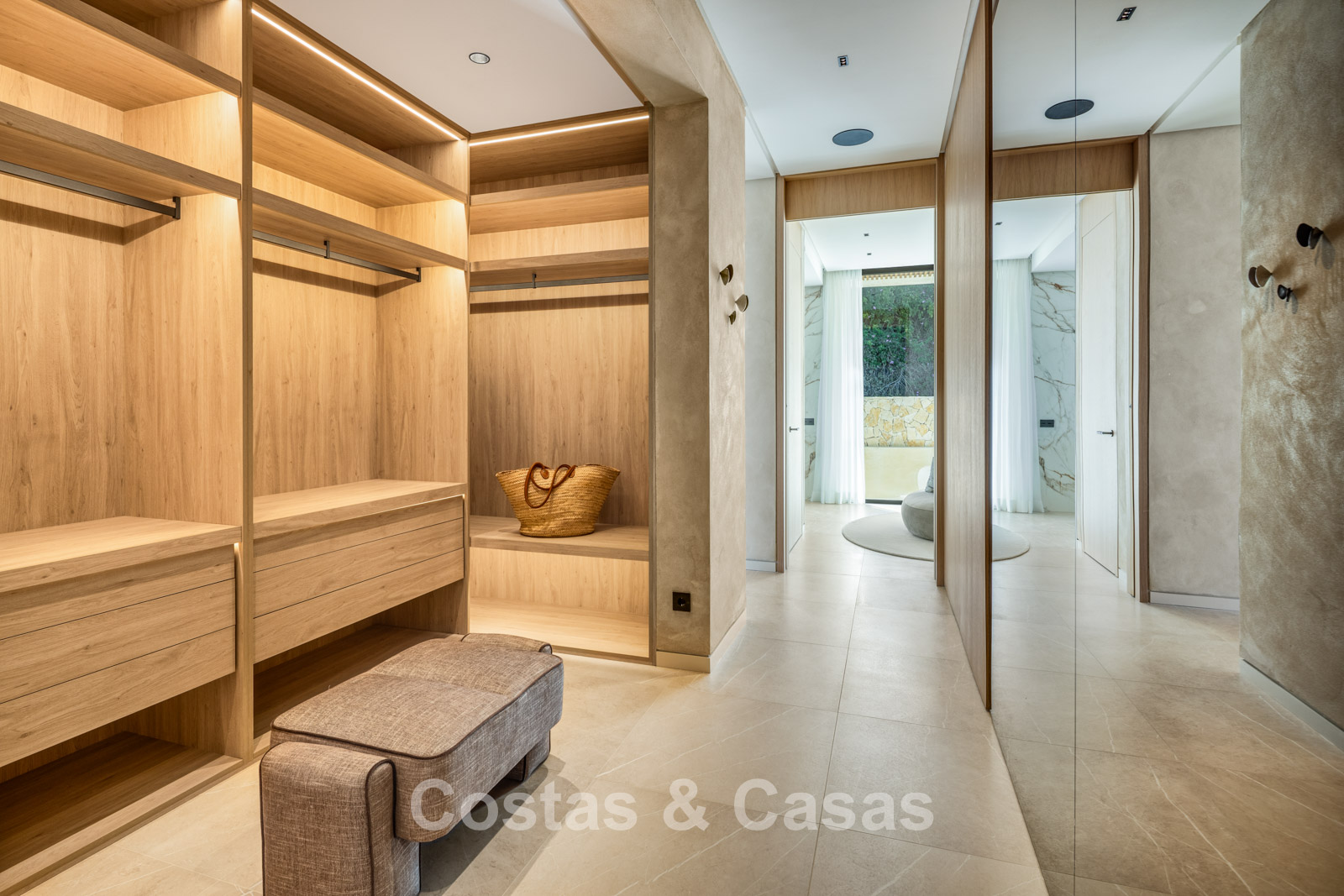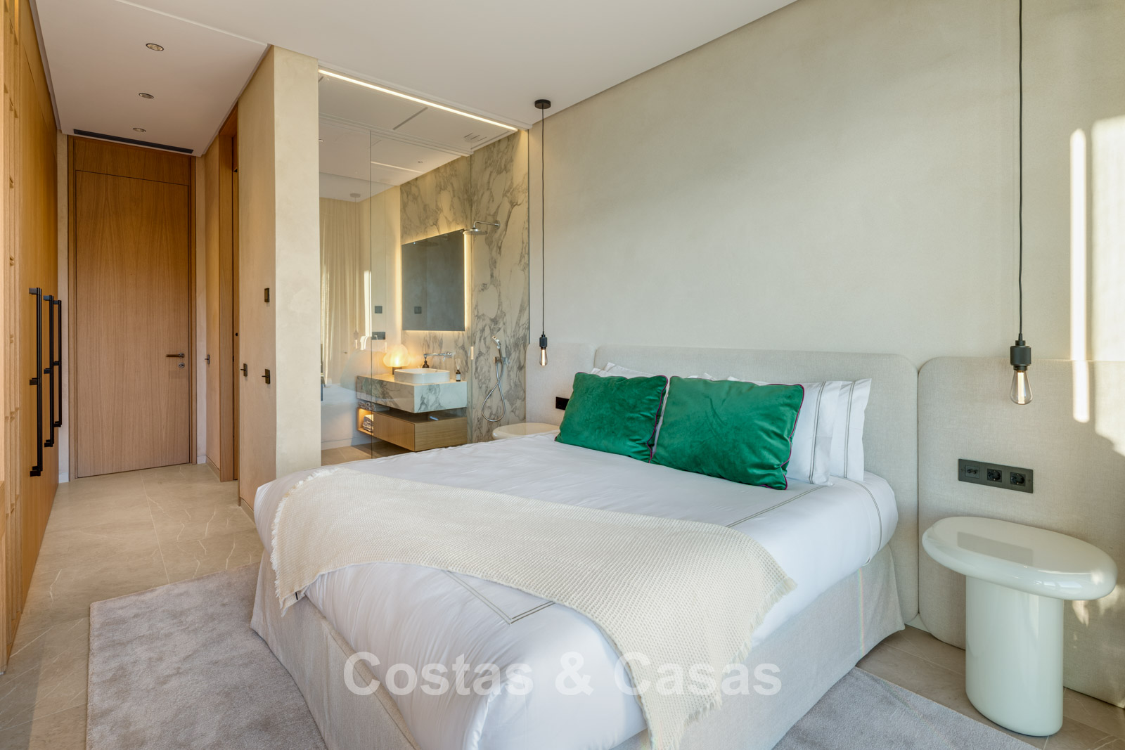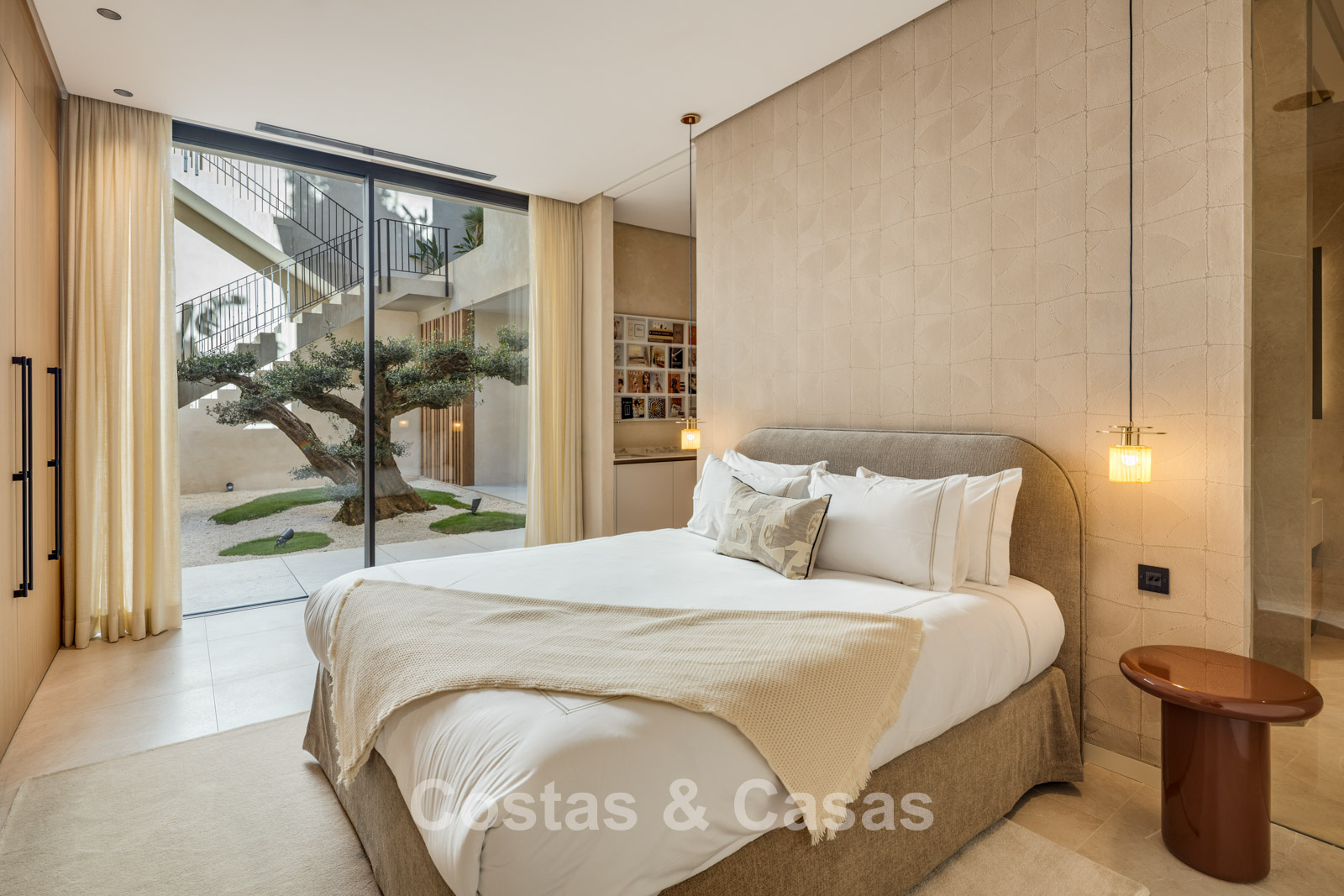 De master suite bevindt zich op de bovenverdieping en voorziet een ruime dressing, badkamer en toegang tot een ruim privéterras.