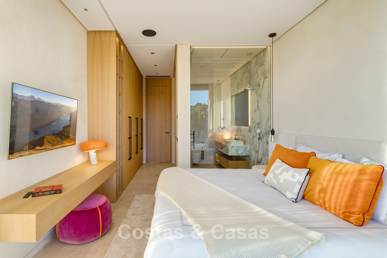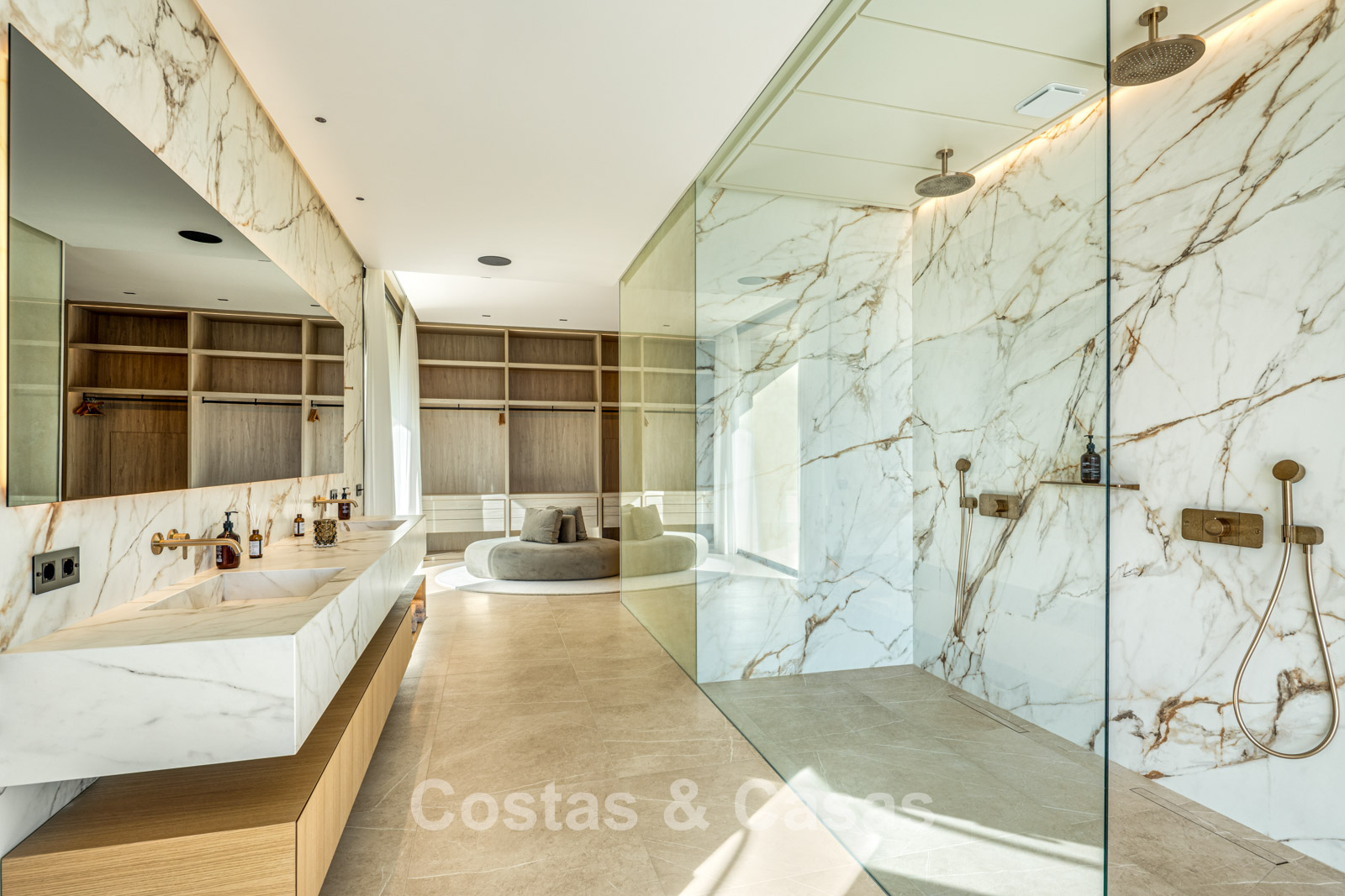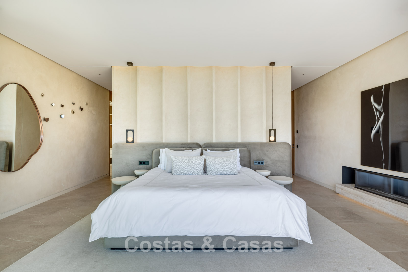 De master suite bevindt zich op de bovenverdieping en voorziet een ruime dressing, badkamer en toegang tot een ruim privéterras.