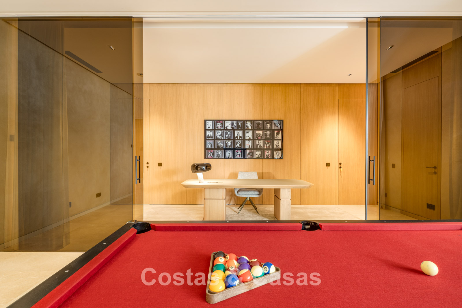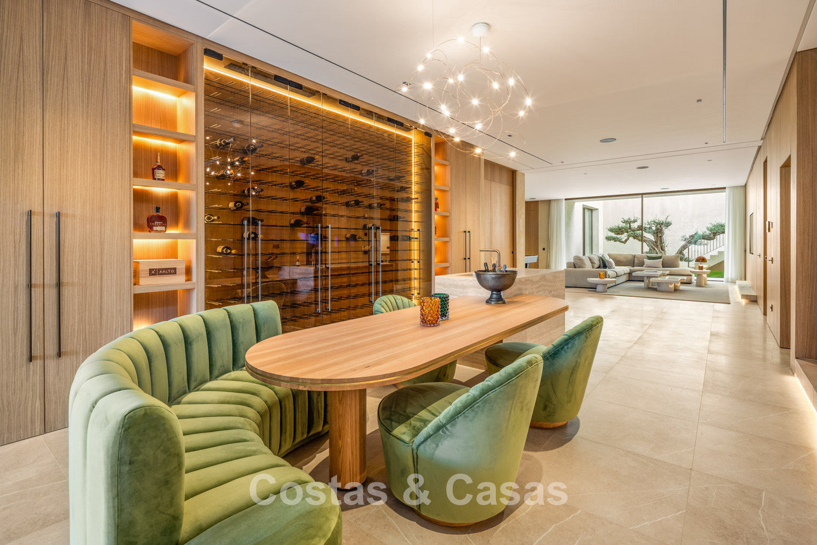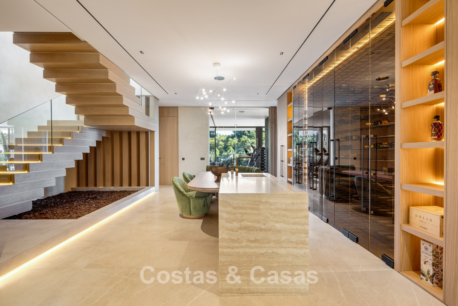 Op de benedenverdieping bevindt zich een recreatieve ruimte, compleet met een tv-lounge, een biljartruimte, een bar met loungehoek en een geklimatiseerde vinotheek.