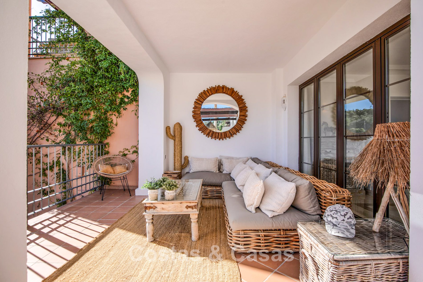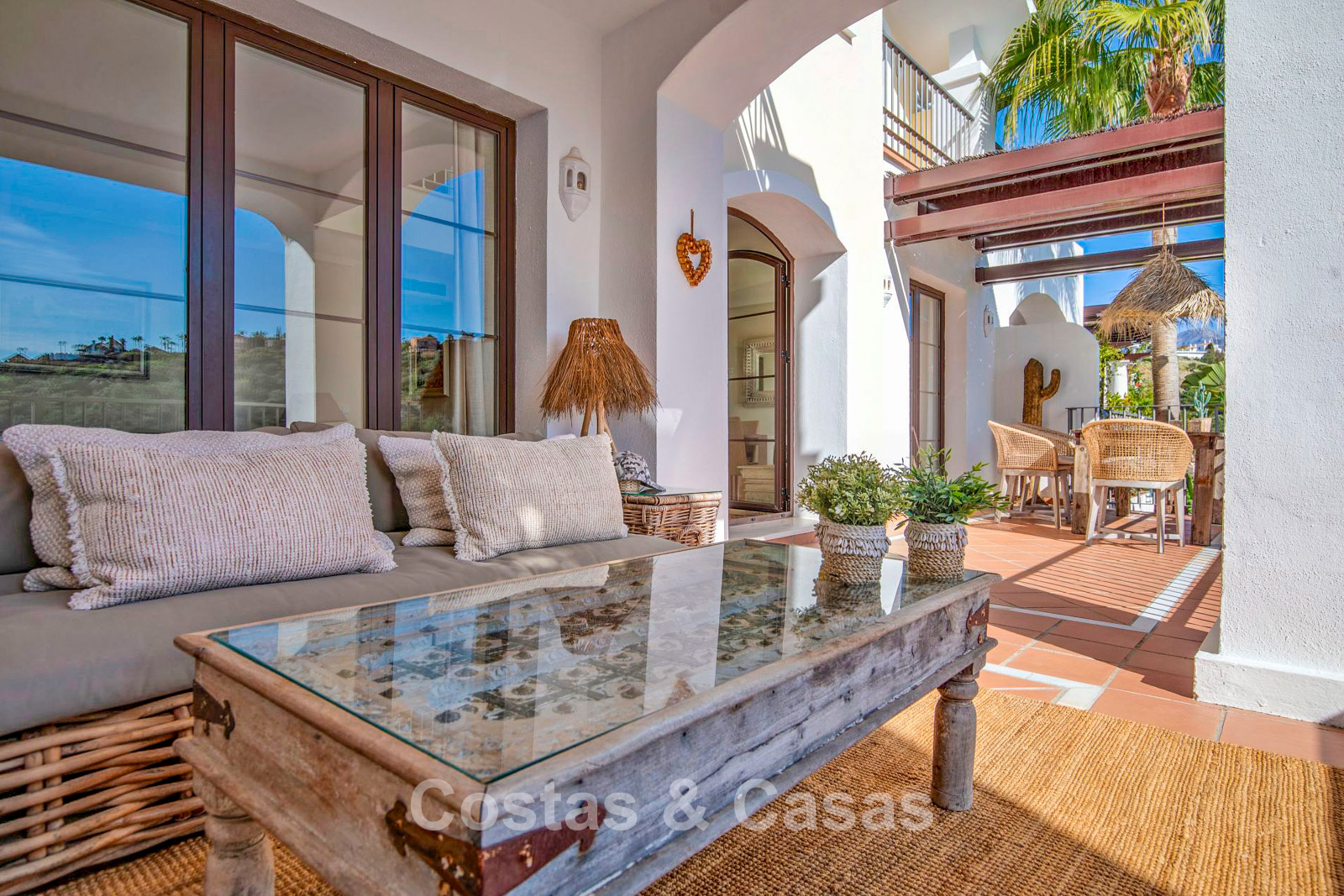 Grote raampartijen bieden toegang tot het deels-overdekte terras, dat smaakvol is ingericht met een loungehoek en een eettafel.