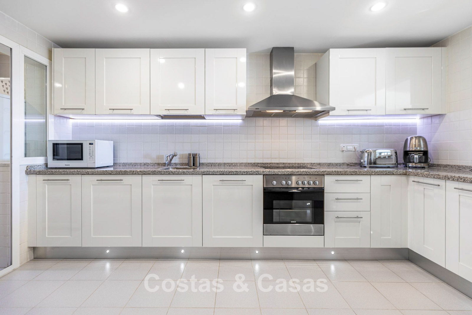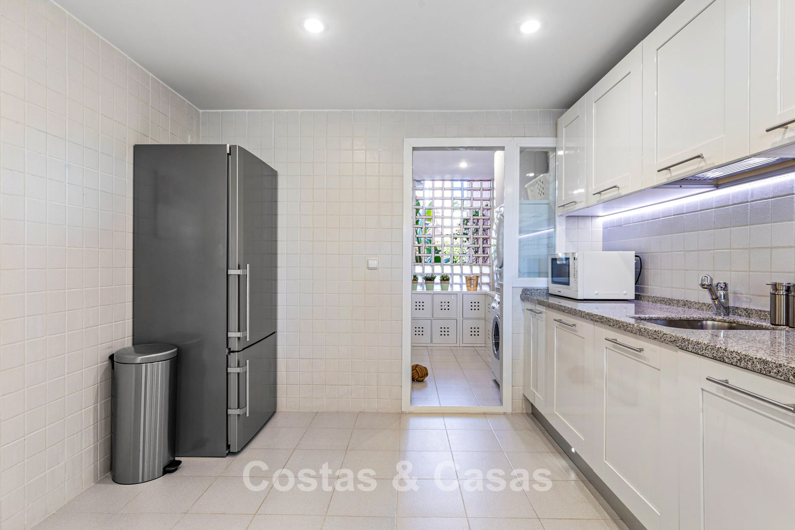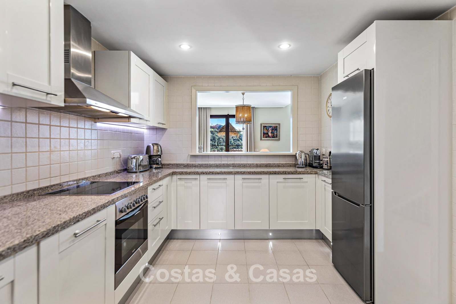 De keuken is volledig geëquipeerd en staat in directe verbinding met de sociale ruimtes van de woning.