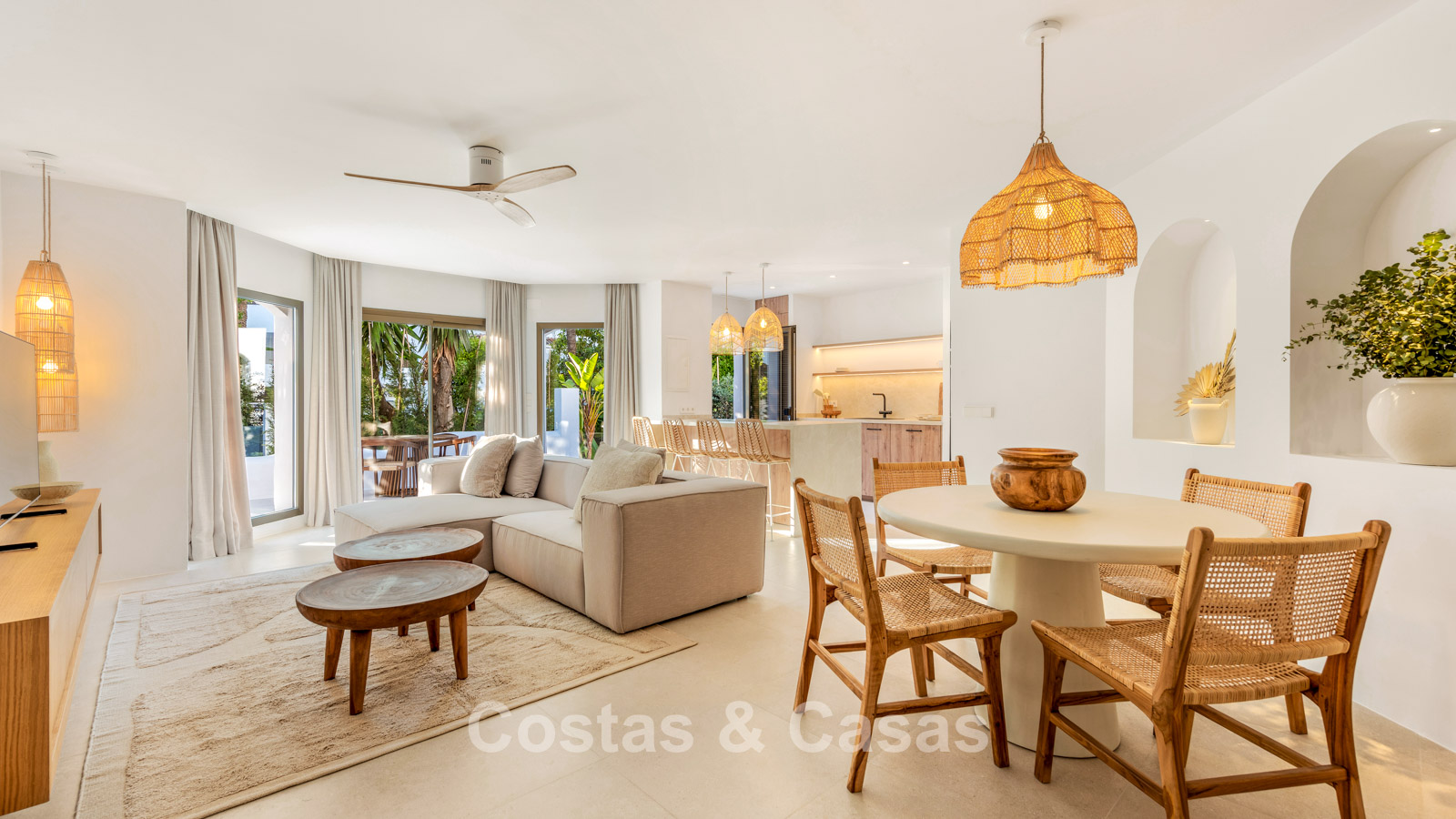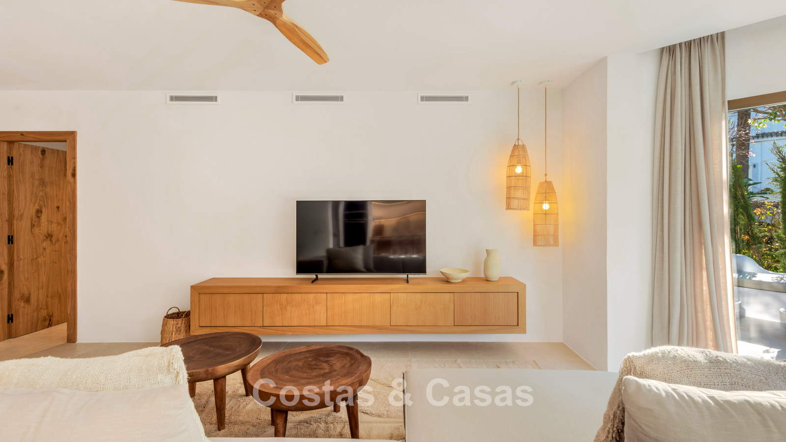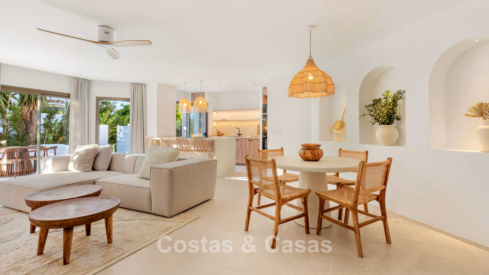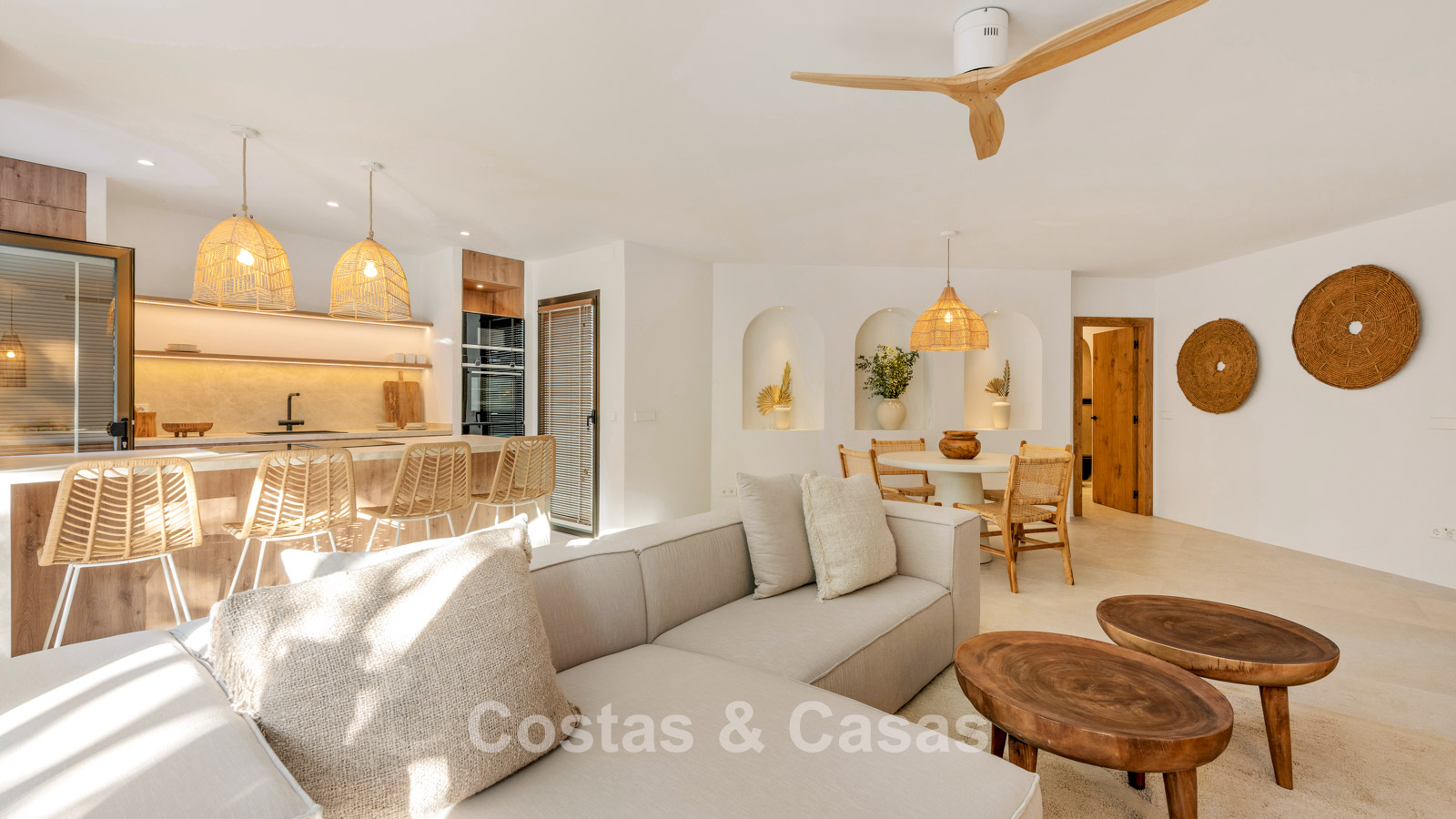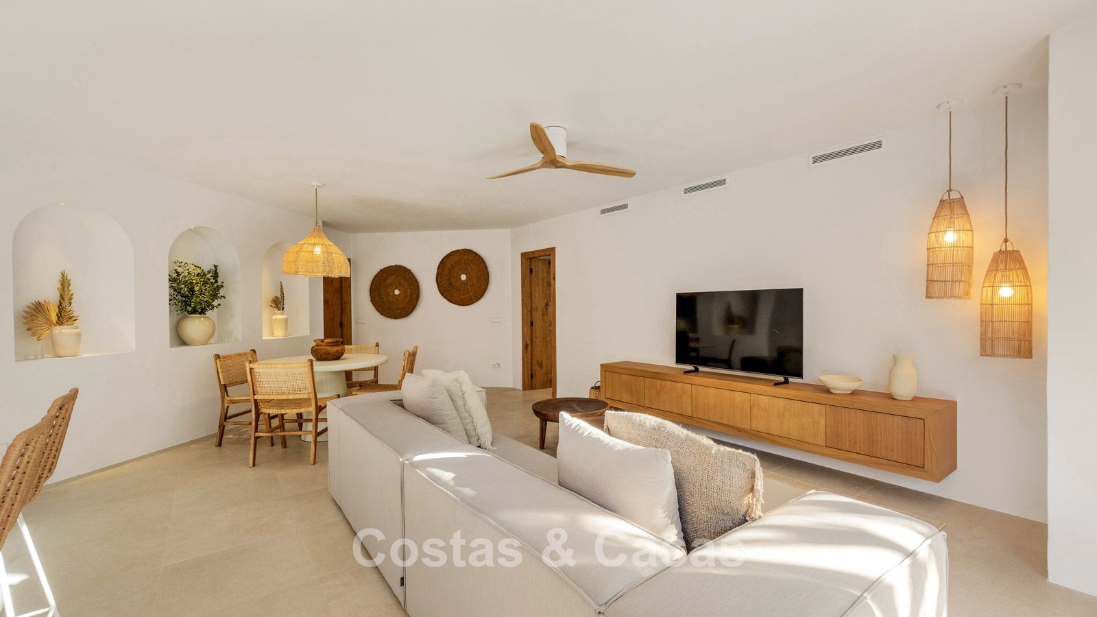 De open woonkamer is ingericht in een verfijnde boho-chique stijl, met lichte kleuren, organische vormen en hoogwaardige natuurlijke afwerkingen.