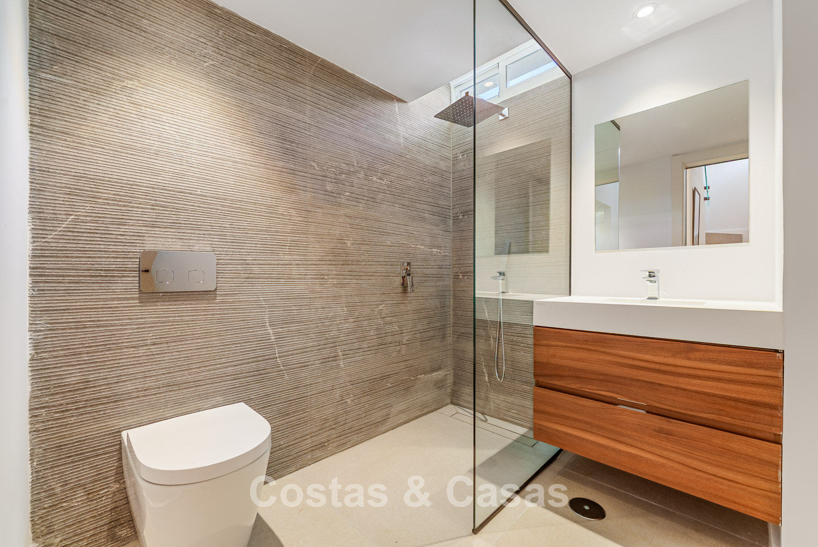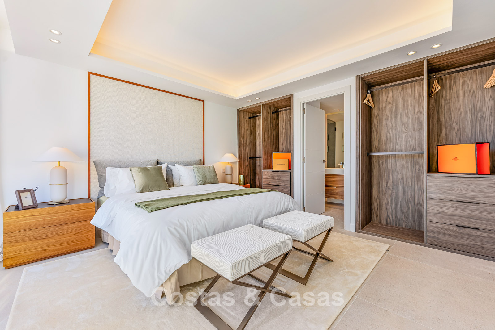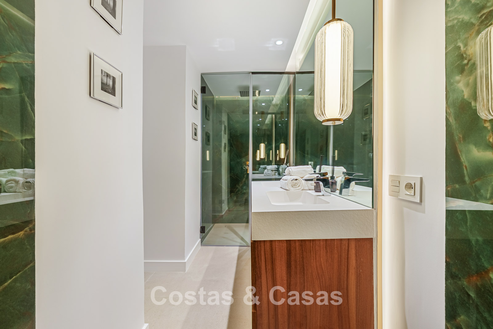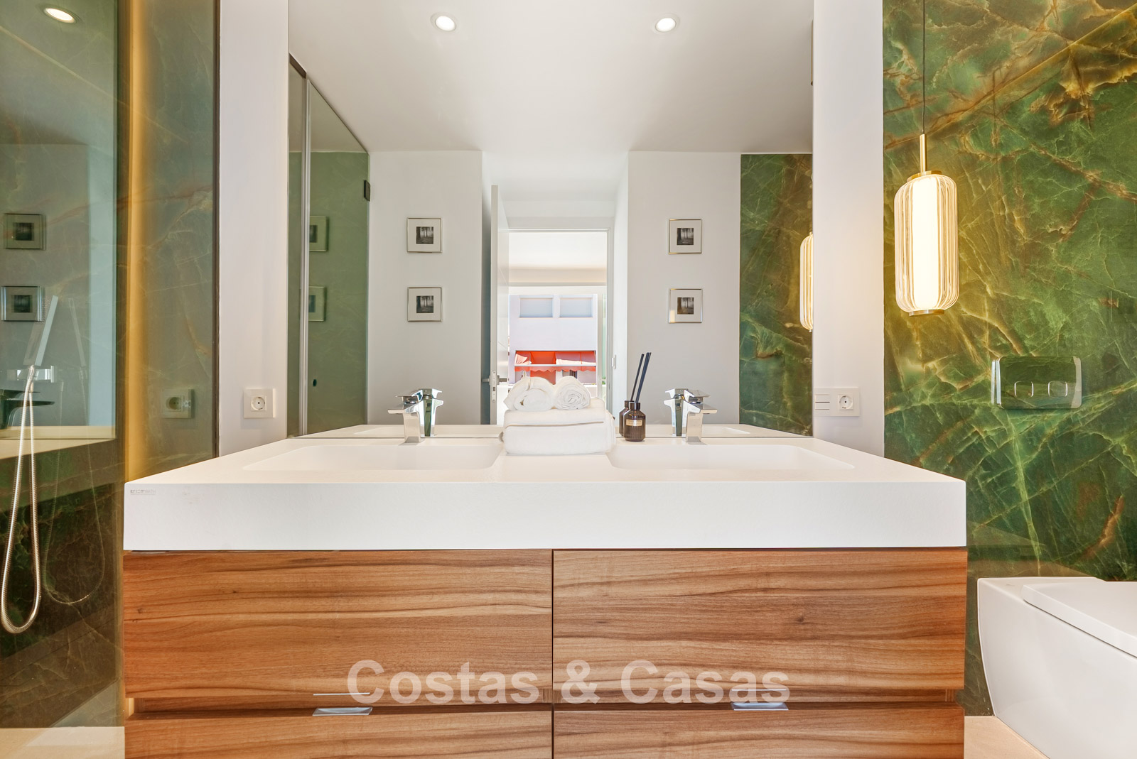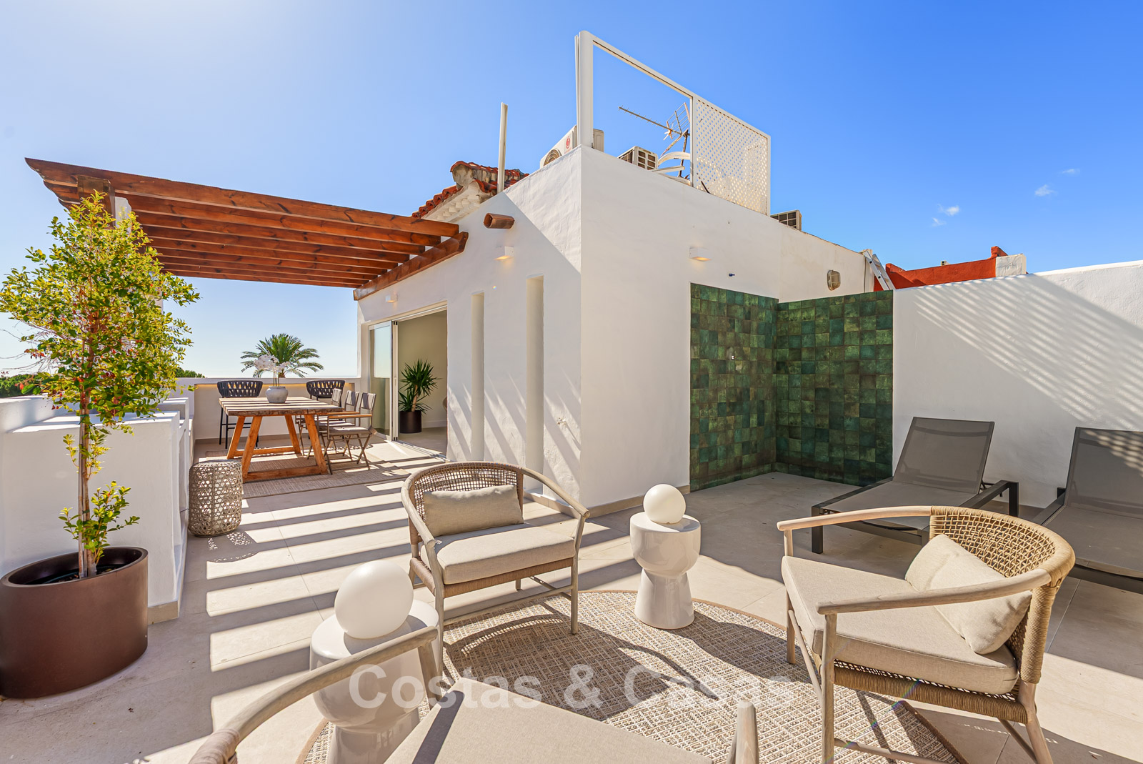 De woning beschikt over 4 goed uitgeruste slaapkamers, waarbij de master suite een eigen terras en een badkamer van groen onyx porselein heeft.