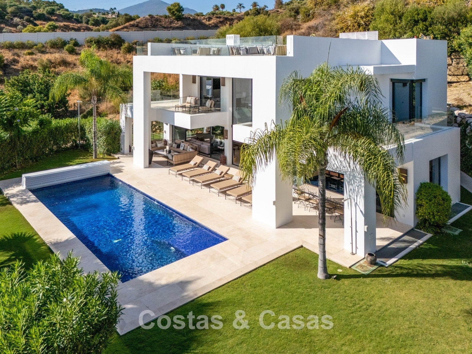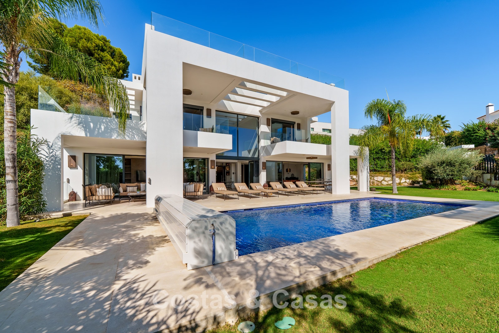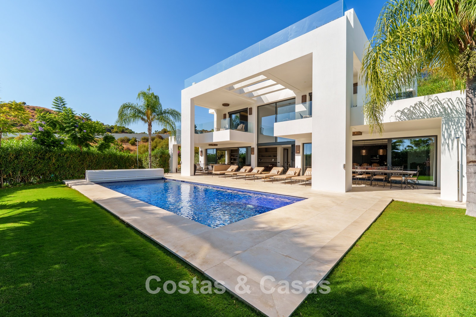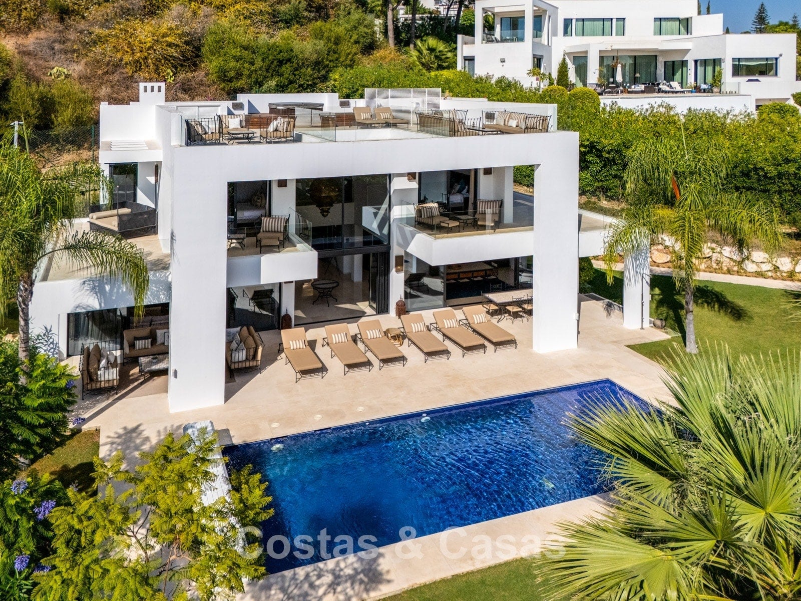 Een privézwembad wordt omgeven door elegante zonneterrassen.