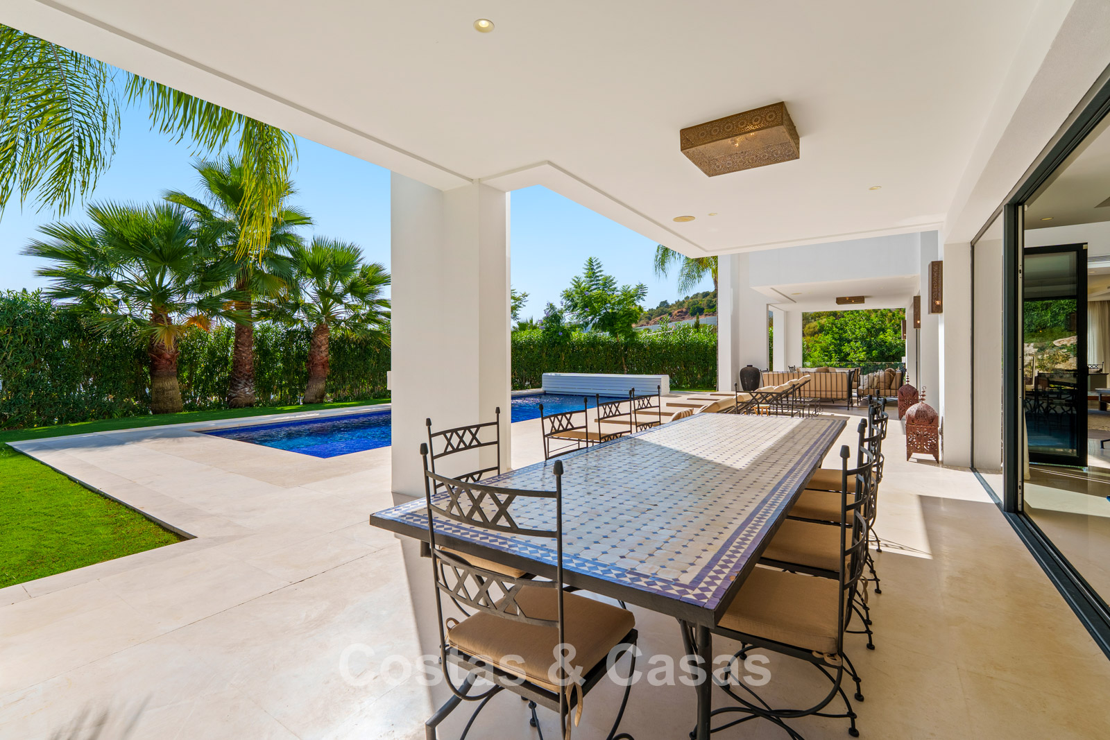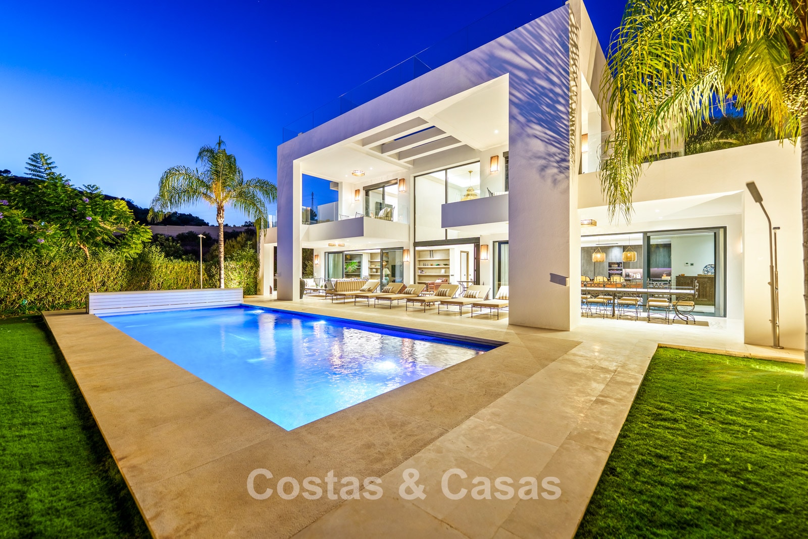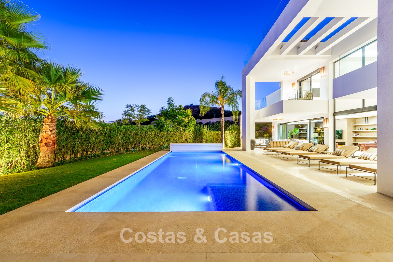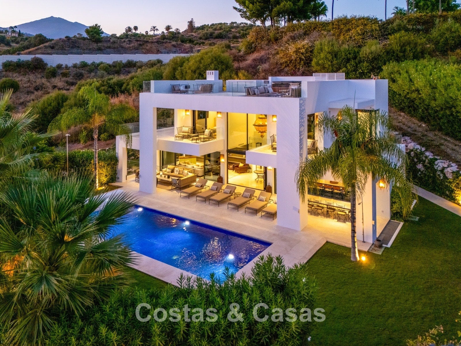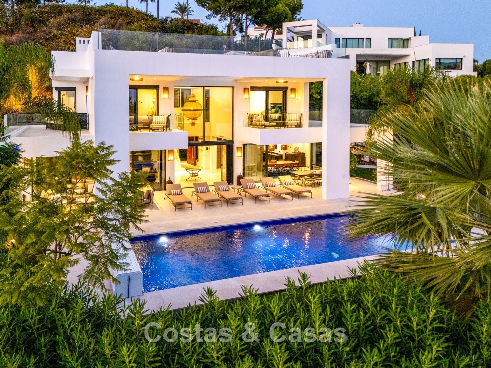 Een privézwembad wordt omgeven door elegante zonneterrassen.
