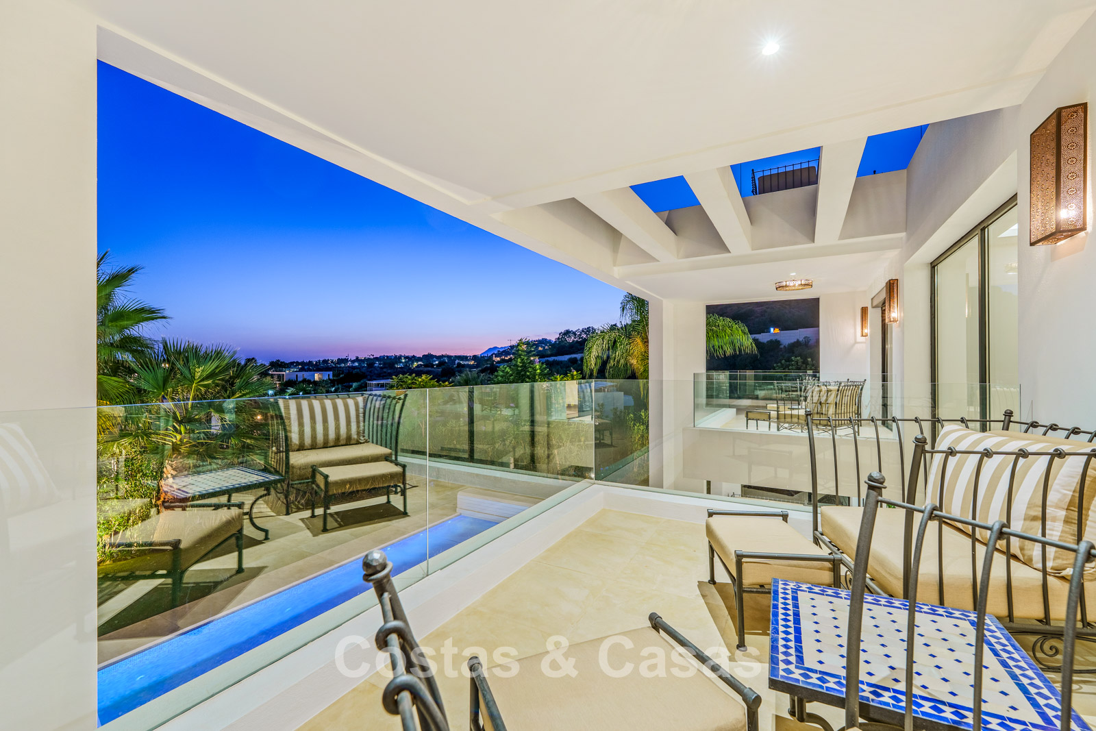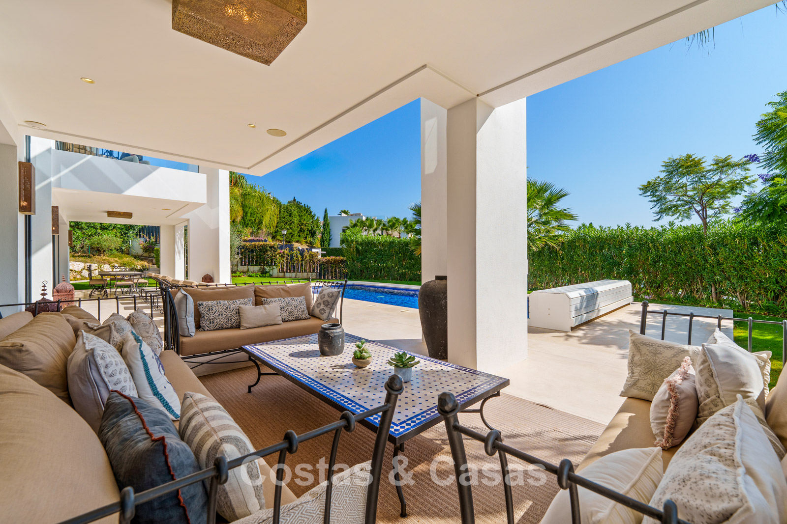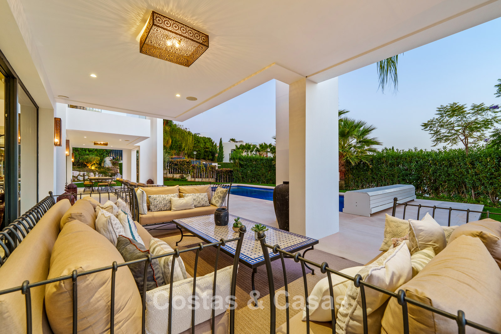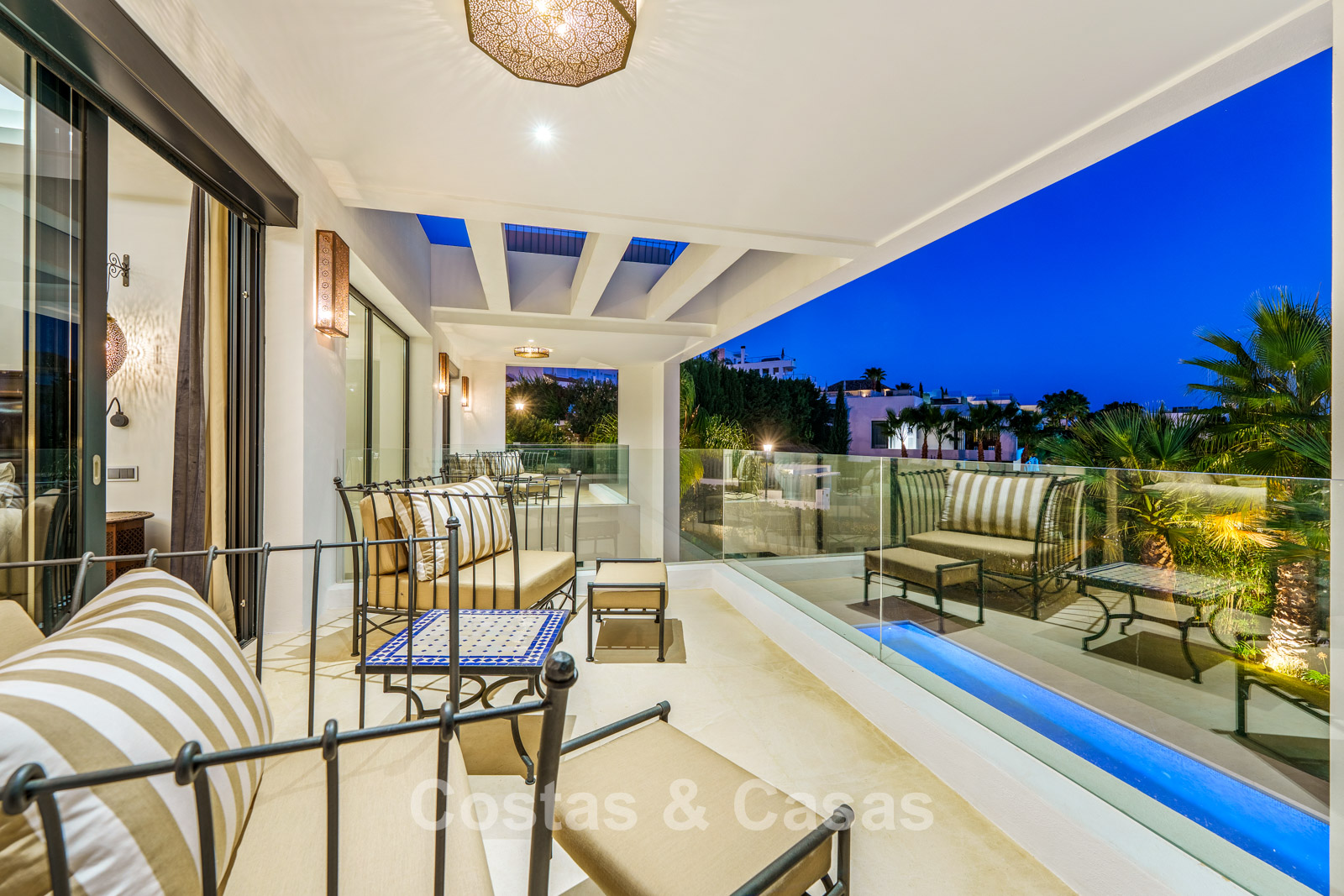 Een privézwembad wordt omgeven door elegante zonneterrassen.