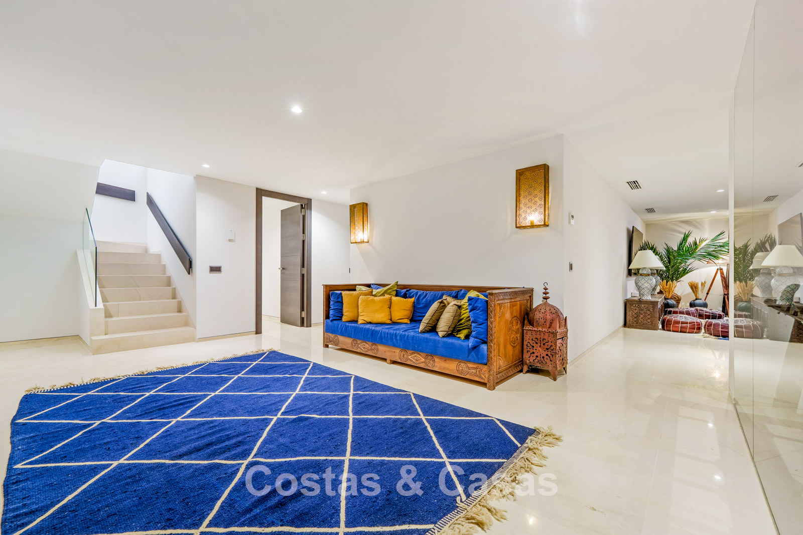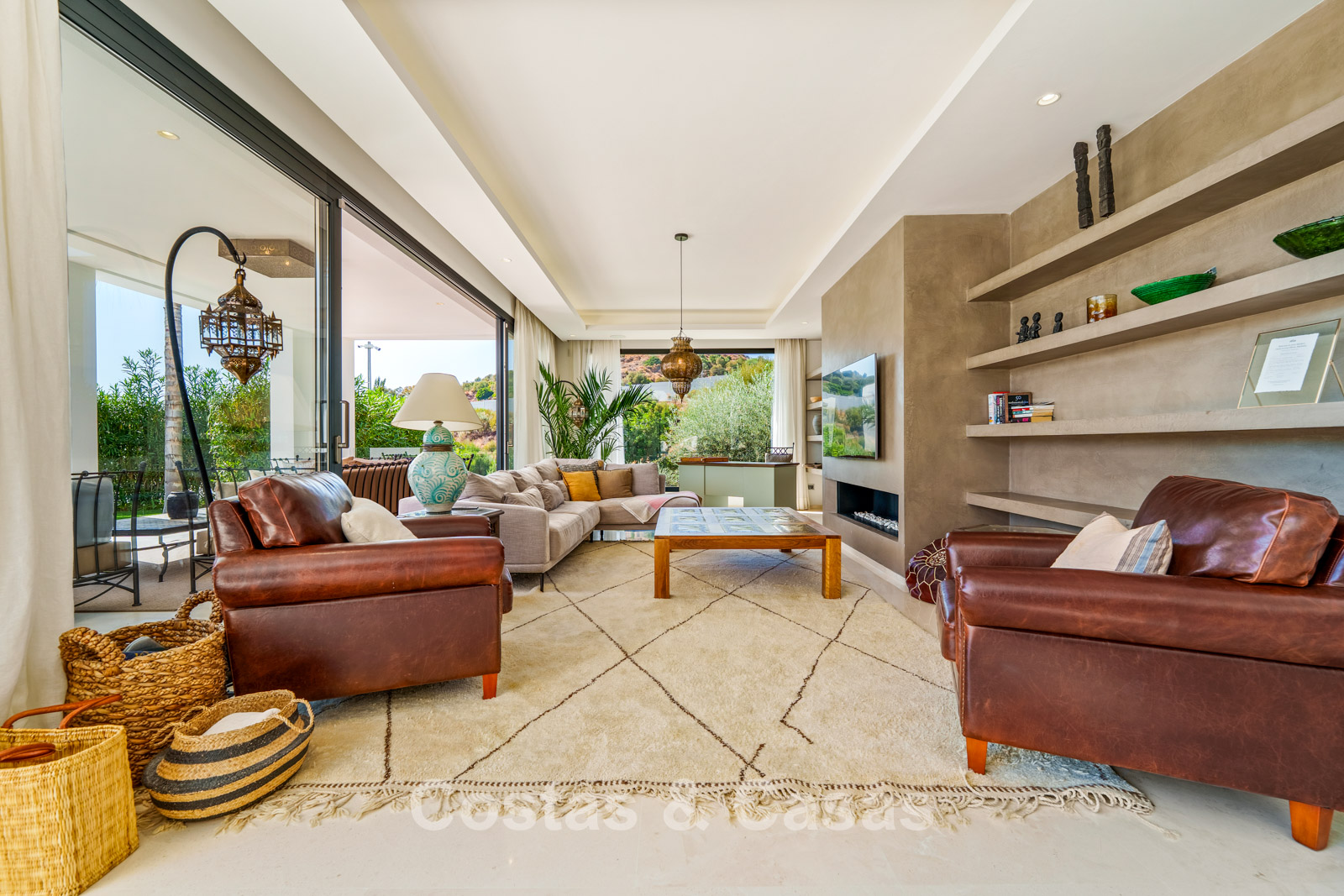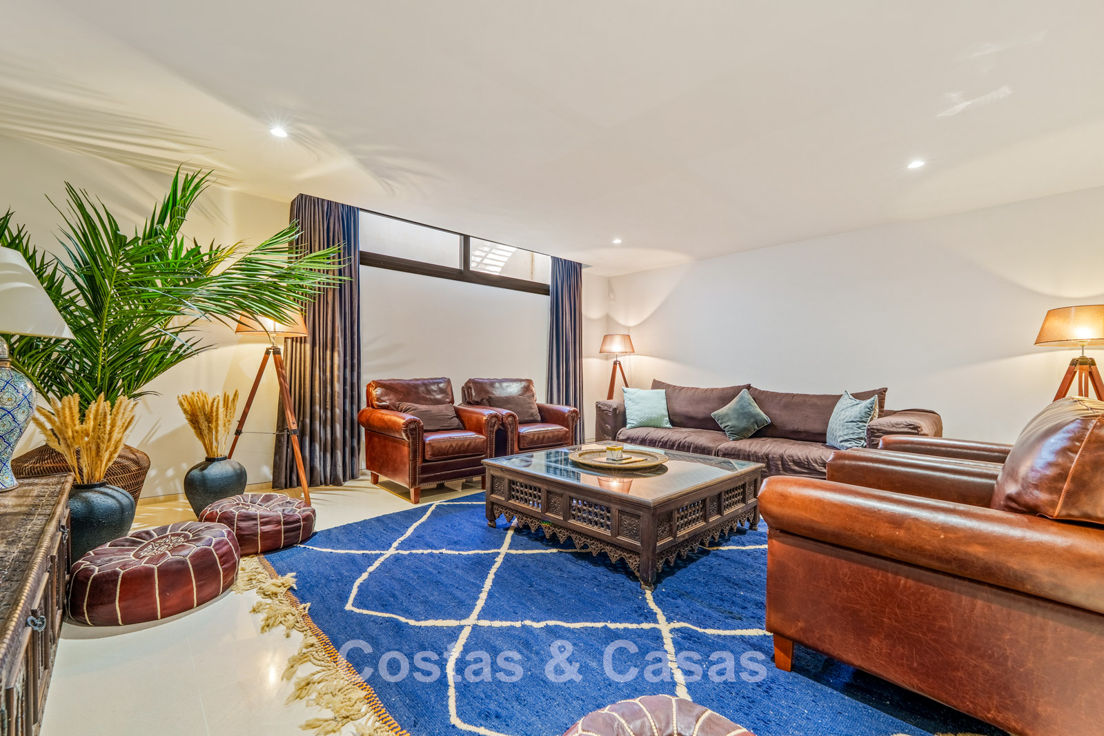 Sfeervolle woonkamer met designmeubilair, warme verlichting en een verfijnde afwerking.