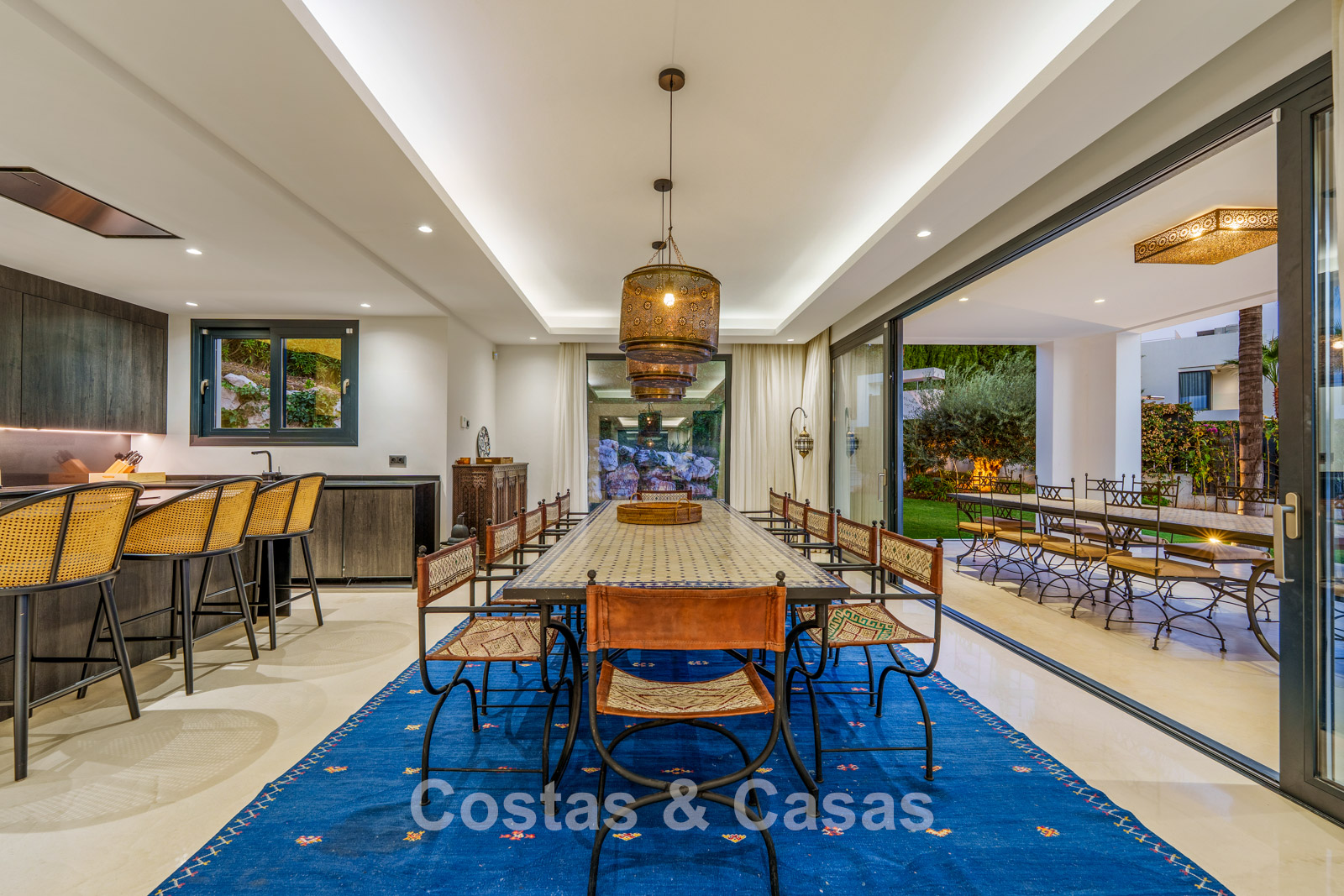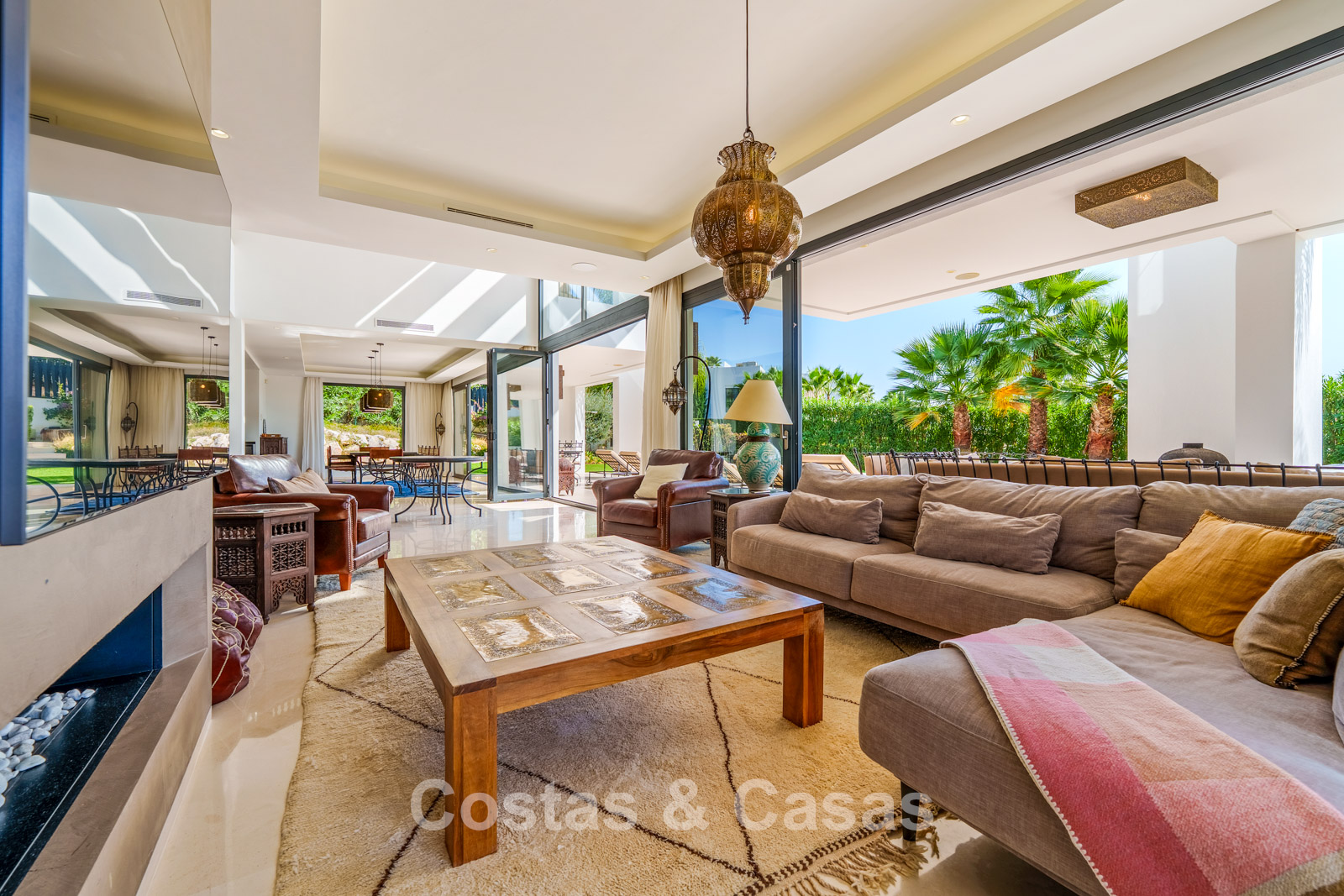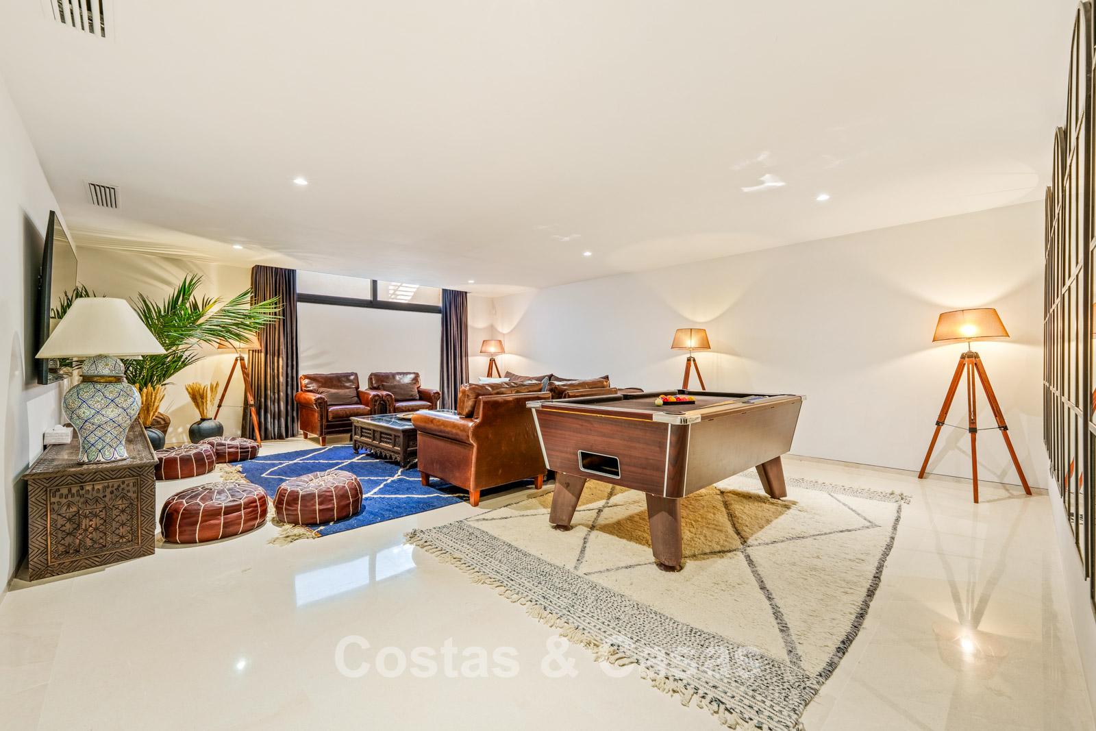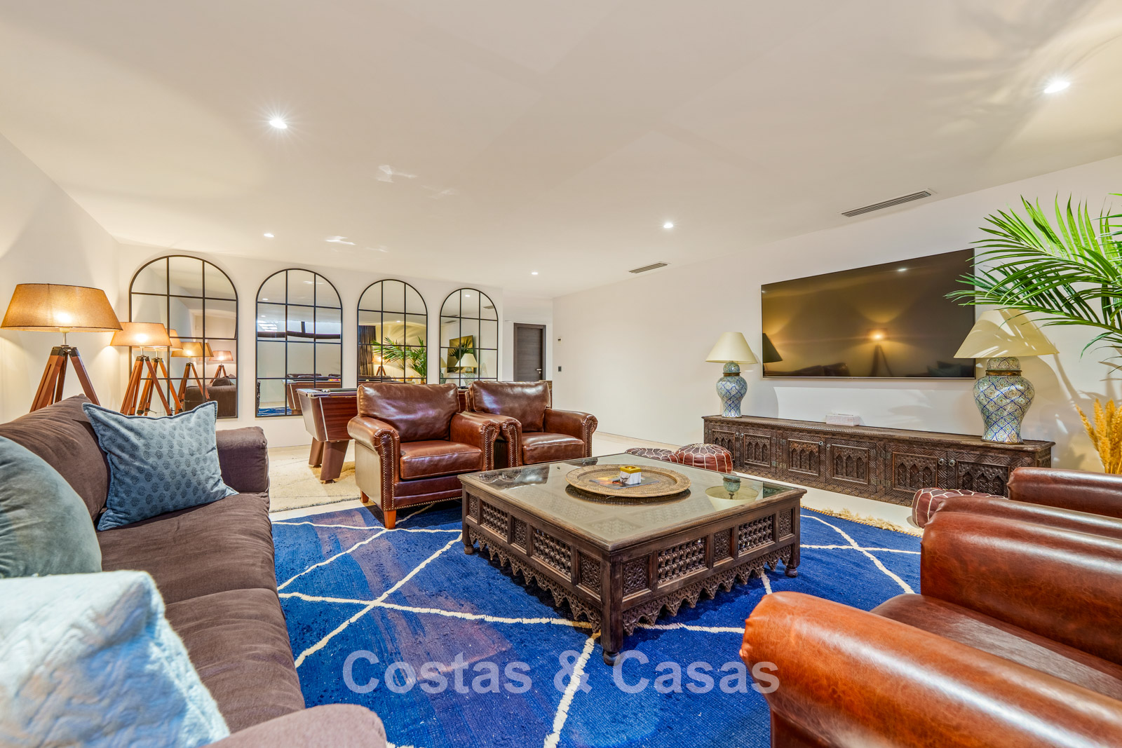 Sfeervolle woonkamer met designmeubilair, warme verlichting en een verfijnde afwerking.