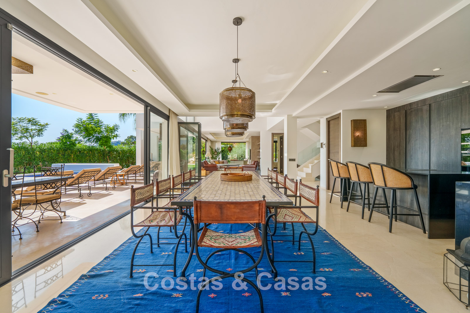 Grote, kamerhoge glazen schuifdeuren verbinden binnen- en buitenleven naadloos met elkaar verbinden.