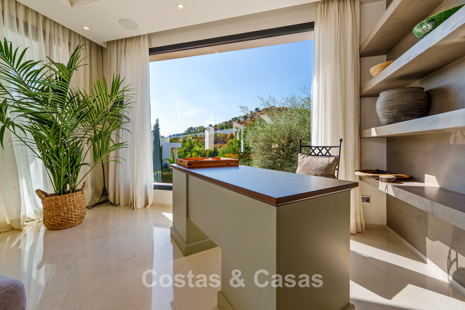 Hoogwaardige afwerking met gebruik van natuurlijke materialen zoals steen, hout en luxe textiel.