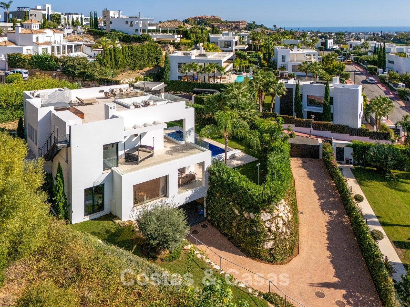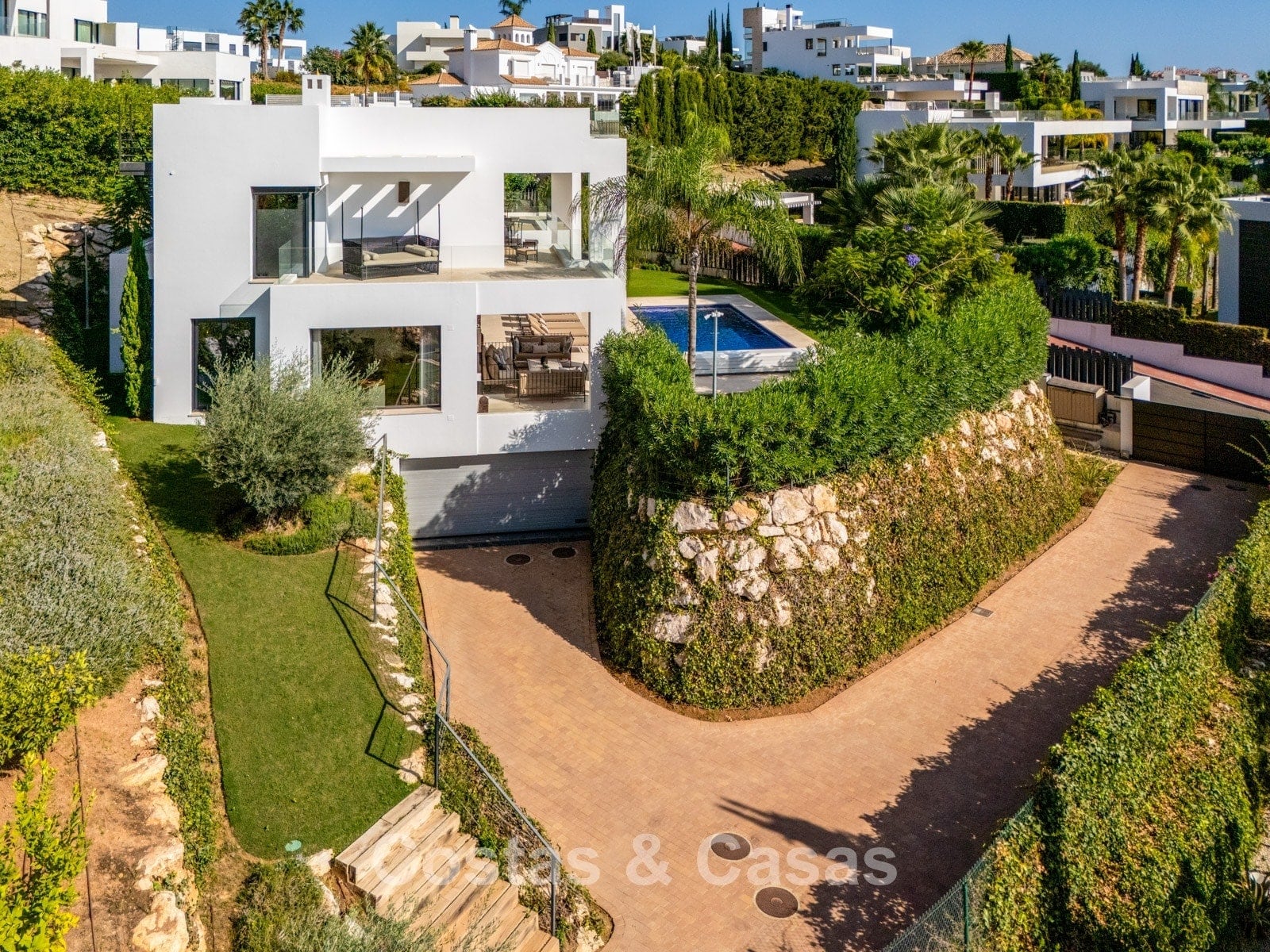 De woning bevindt zich in een buurt met vergelijkbare, hedendaagse villa’s en een moderne uitstraling.