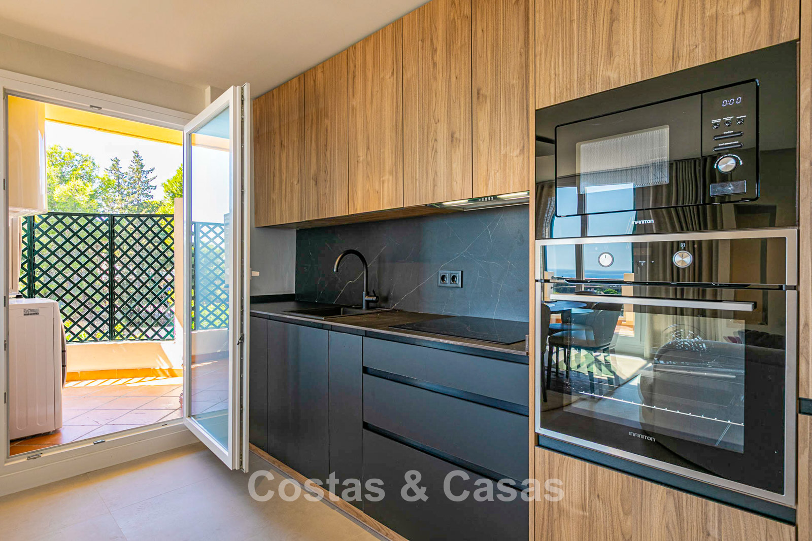 De moderne wandkeuken combineert warm hout met moderne zwarte accenten, waardoor een minimalistisch geheel ontstaat.