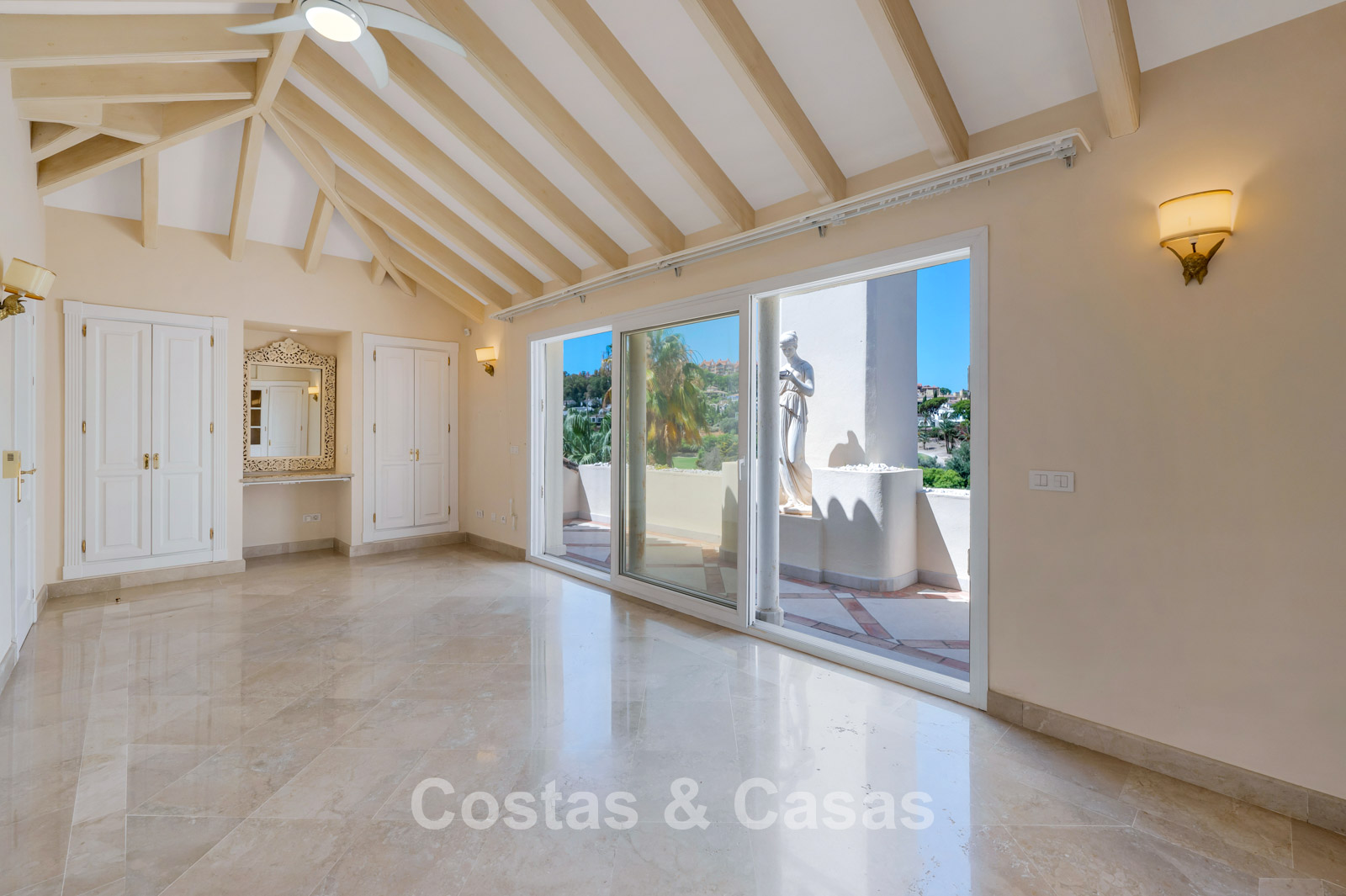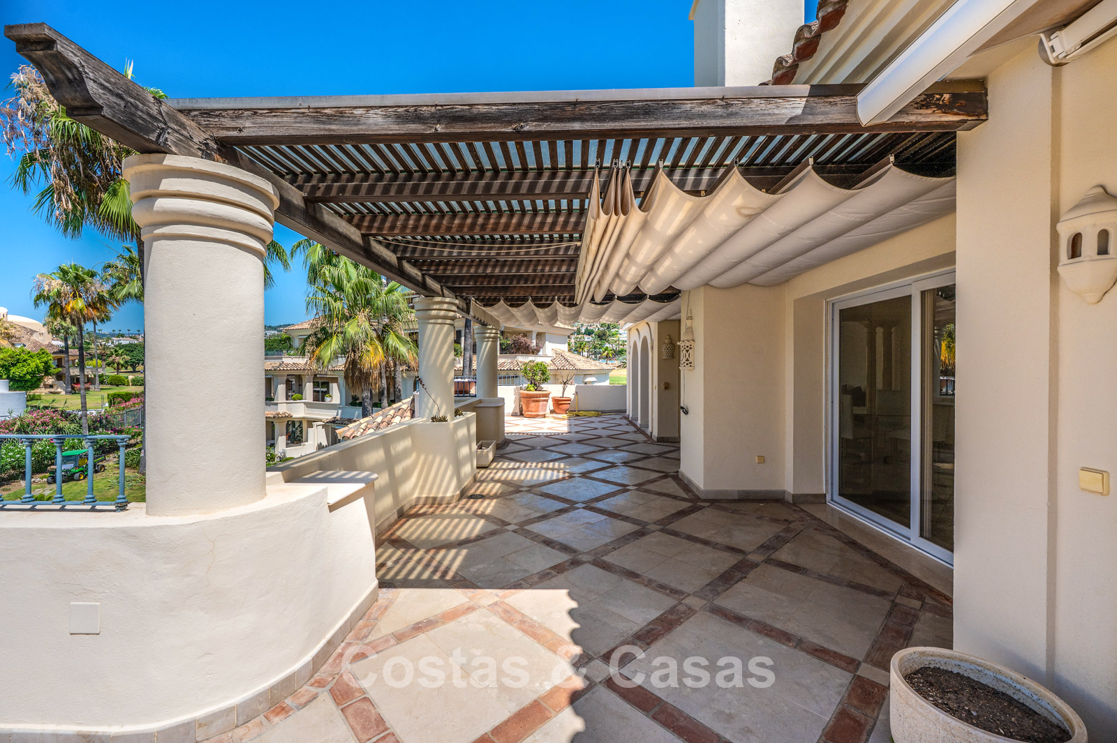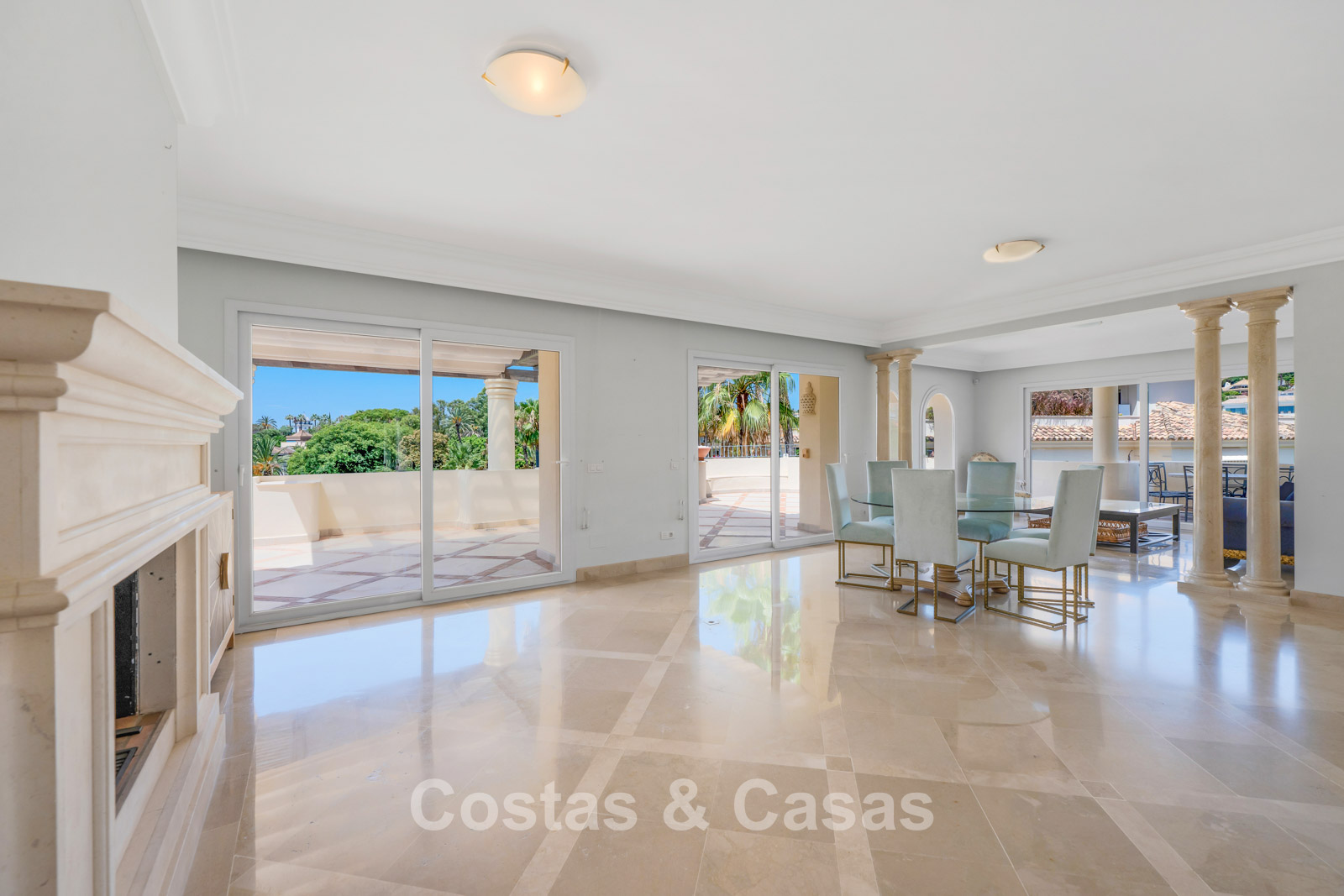Hoge schuiframen bieden toegang tot de uitgestrekte terrassen.