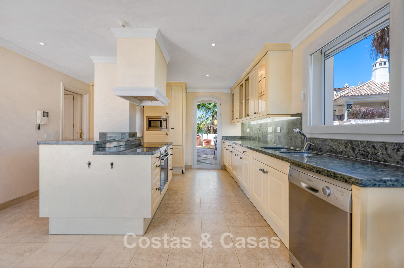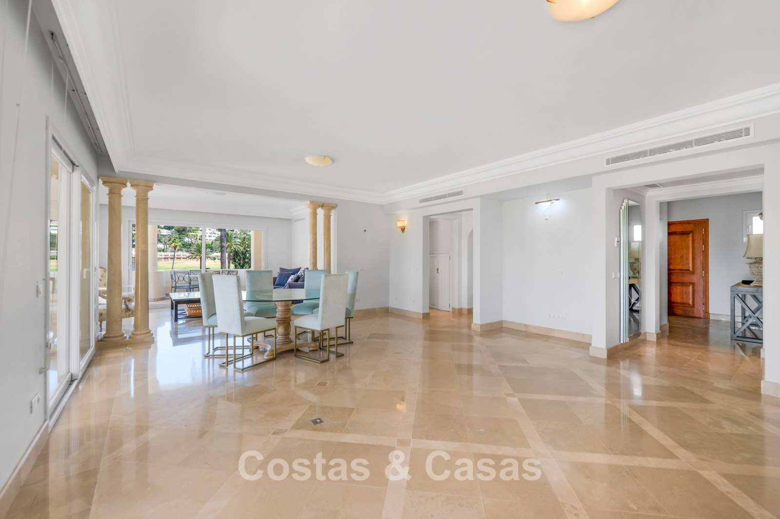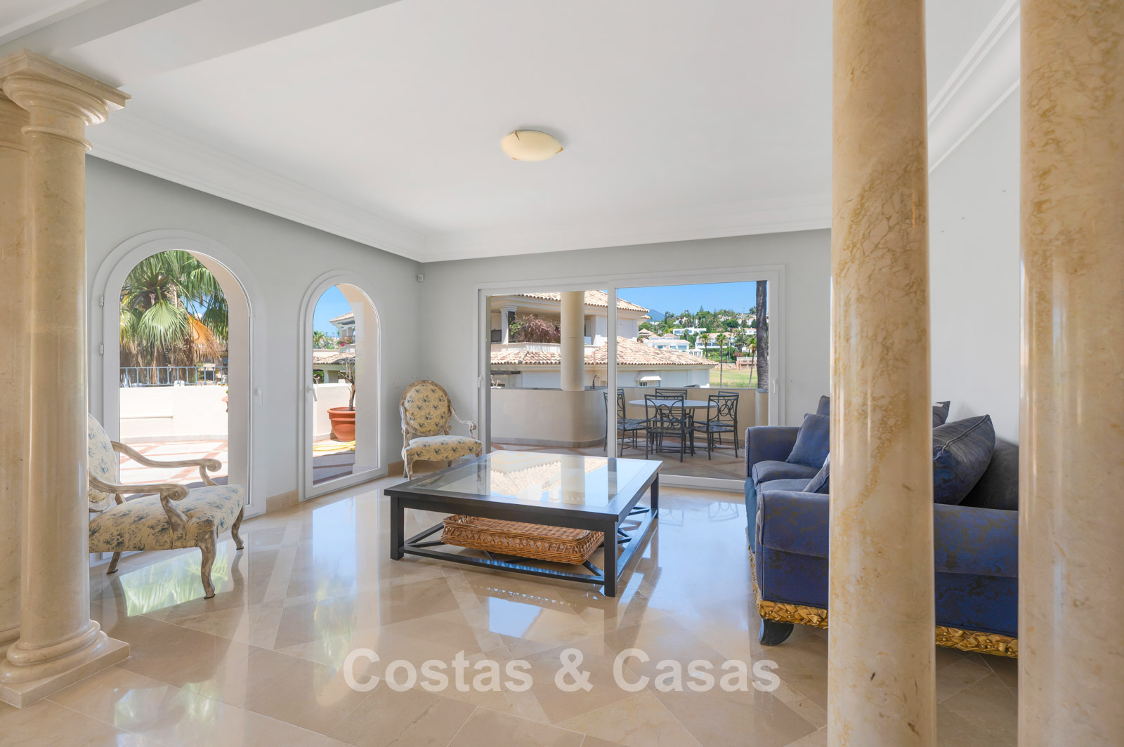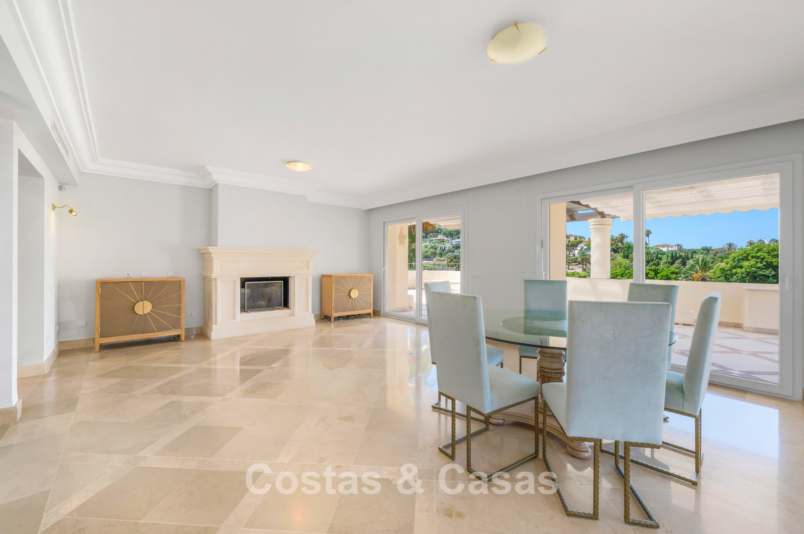 Hoge schuiframen bieden toegang tot de uitgestrekte terrassen.