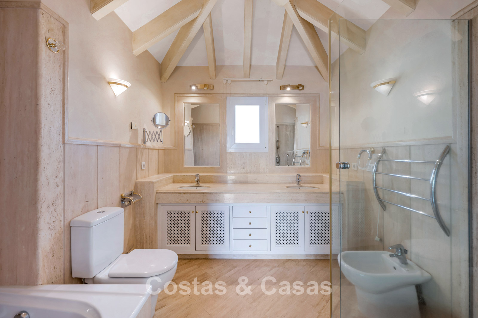De master suite straalt karakter en elegantie uit dankzij het gewelfde balkenplafond, dat naadloos doorloopt in de en-suite badkamer met ligbad en inloopdouche.